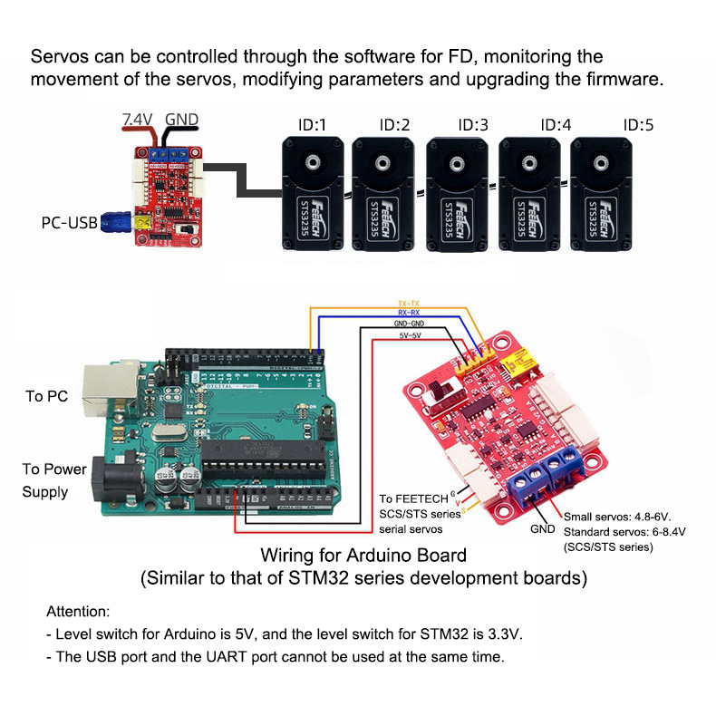 - Serial bus servo: One I/O port can connect multiple servos in series to reduce the occupation of serial ports, enabling simple wiring and beautiful appearance. Multiple servos are allowed in a bus control network, so each servo is assigned a unique ID number within the network. The control instruction issued by the controller contains ID information, and only the servo that matches the ID number can fully receive this instruction and return the answer information.