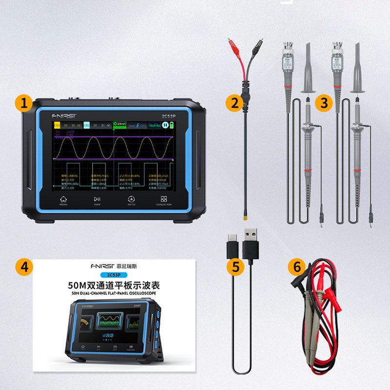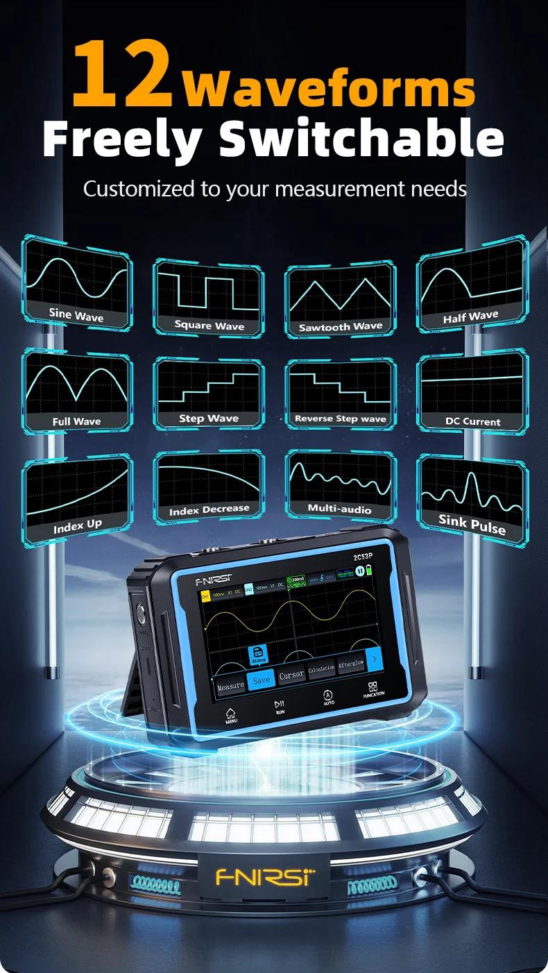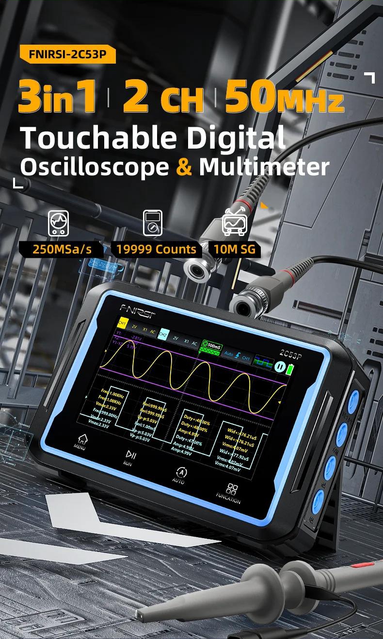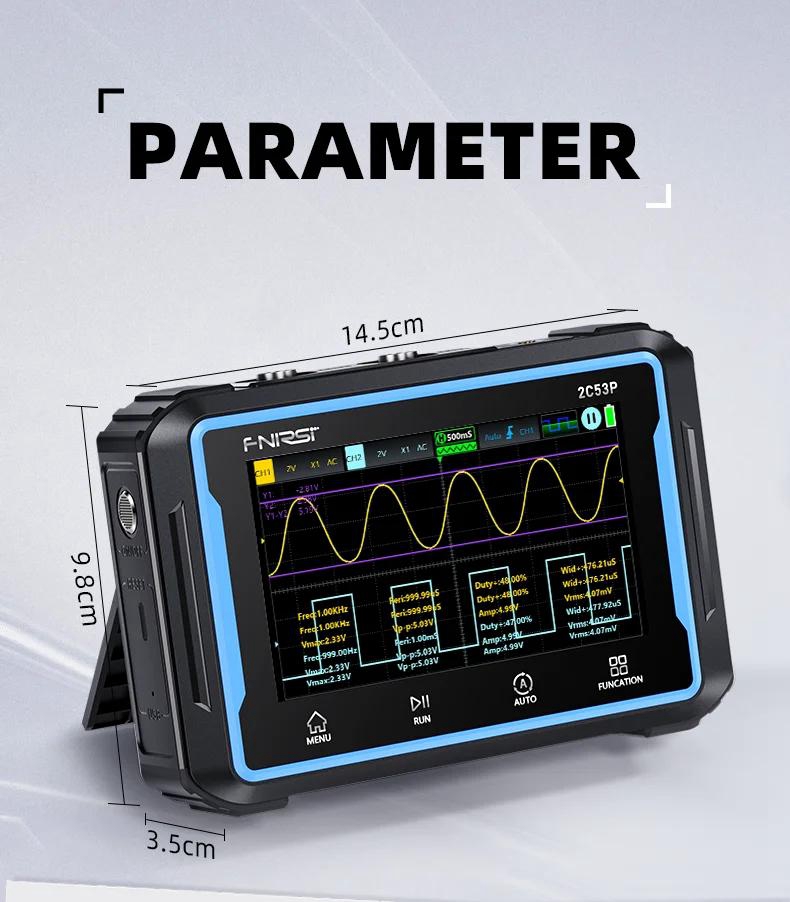 - FNIRSI-2C53P is a three-in-one dual-channel model launched by FNIRSI with comprehensive functions and high practicality, targeting people in the maintenance and R&D industries.