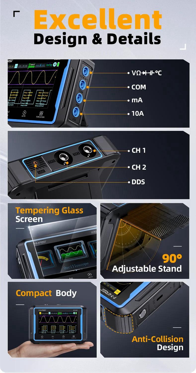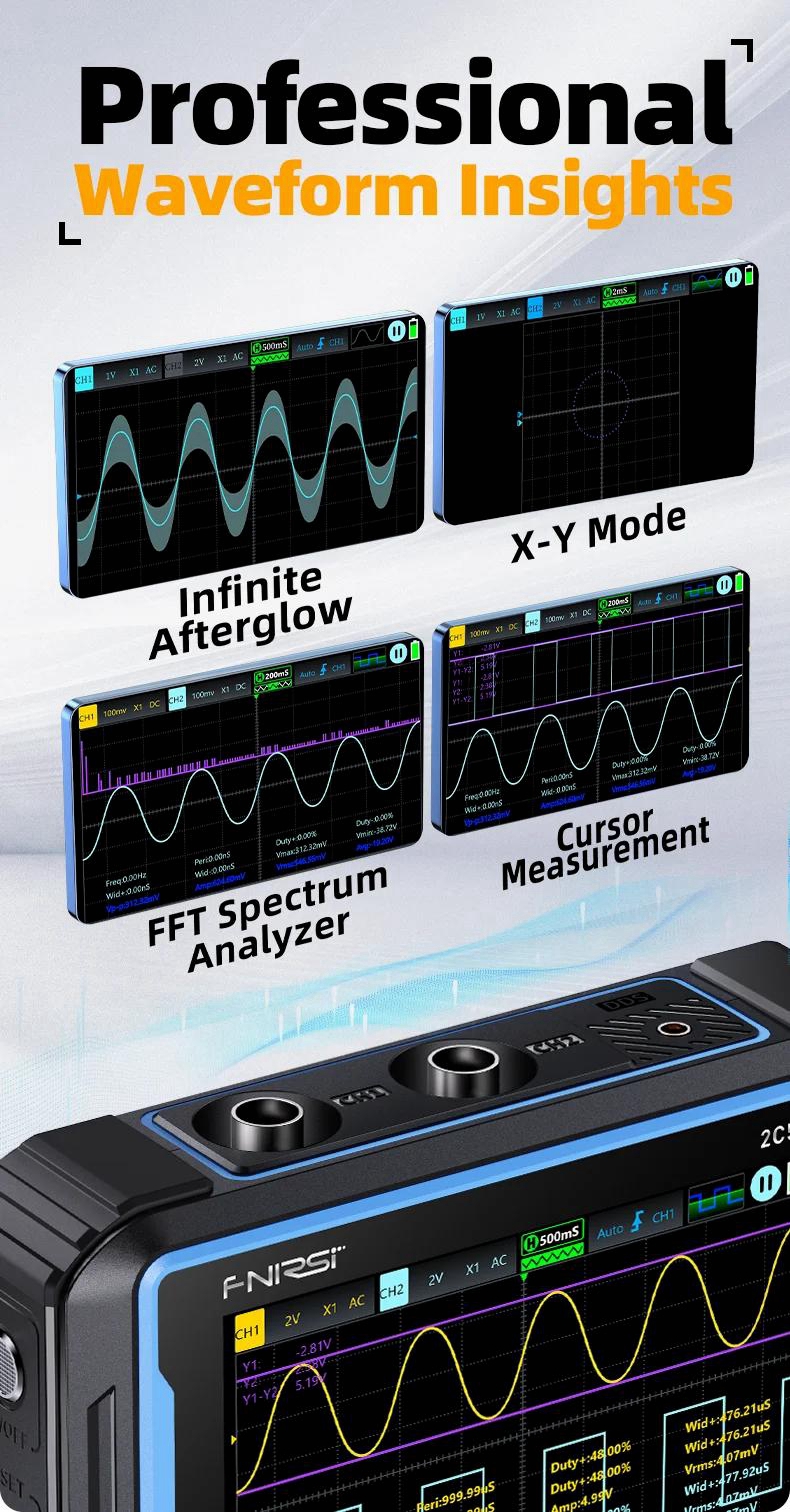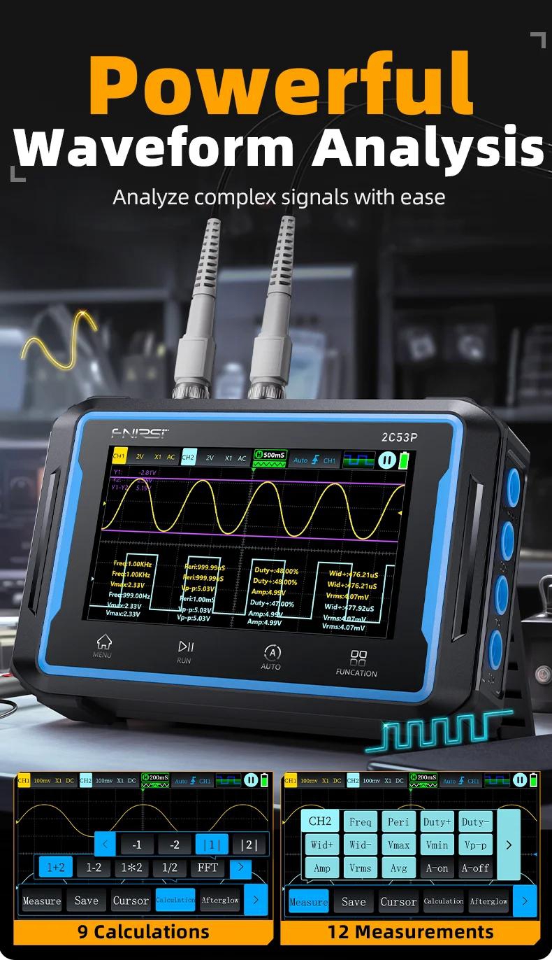 - FNIRSI-2C53P is a three-in-one dual-channel model launched by FNIRSI with comprehensive functions and high practicality, targeting people in the maintenance and R&D industries.