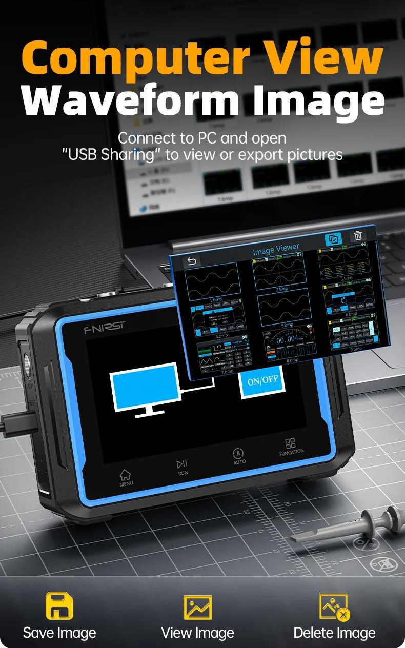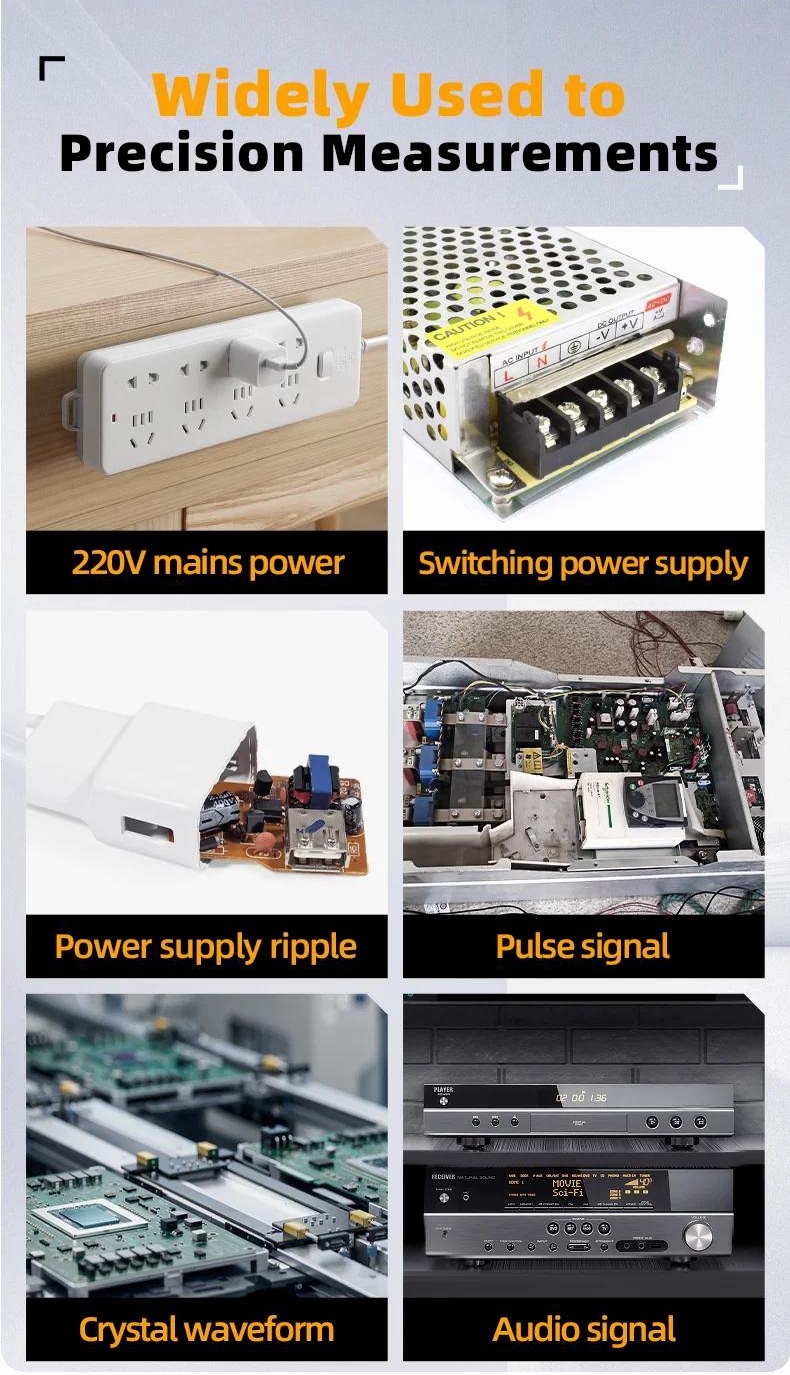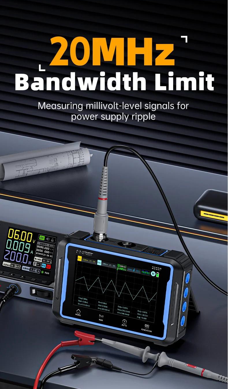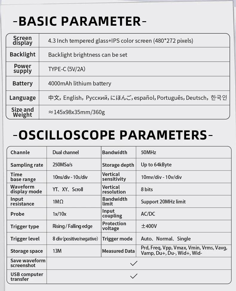 - It has a sampling rate of 250MS/s, an analog bandwidth of 50Mhz, a built-in high-voltage protection module, and supports a maximum peak voltage measurement of ±400V; supports waveform screenshots.