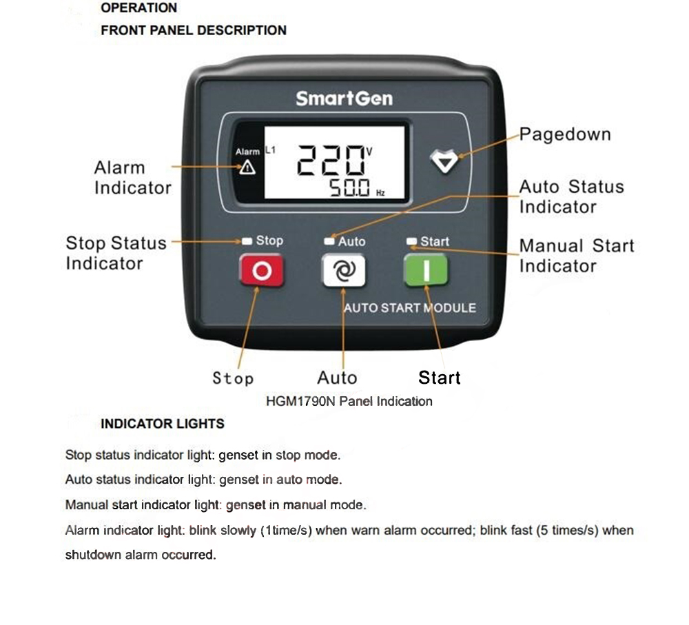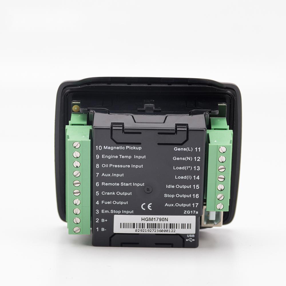 HGM1790N genset controller is suit for single unit automation and monitoring control (also can be used for pumping unit). It can be started and stopped manually or via a remote start/stop signals. HGM1790N controller can supervise and protect genset operation by gathering and analyzing genset data like generate voltage, current, water temperature, oil pressure and so on, and graphical LCD monitor on the front panel displays fault conditions and provides effective alarm signals so as to do maintenance as soon as possible. Moreover, parameter threshold and delay value can be adjusted via front panel or USB port (communicated with PC software).