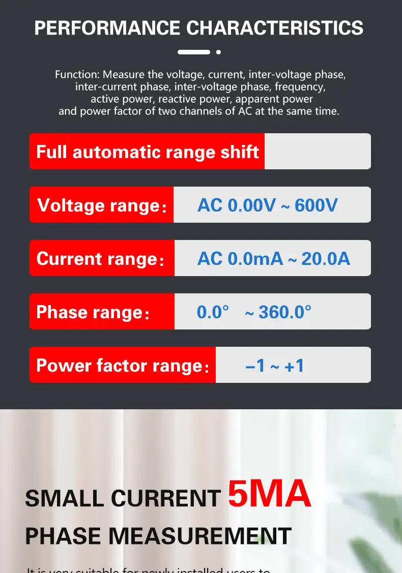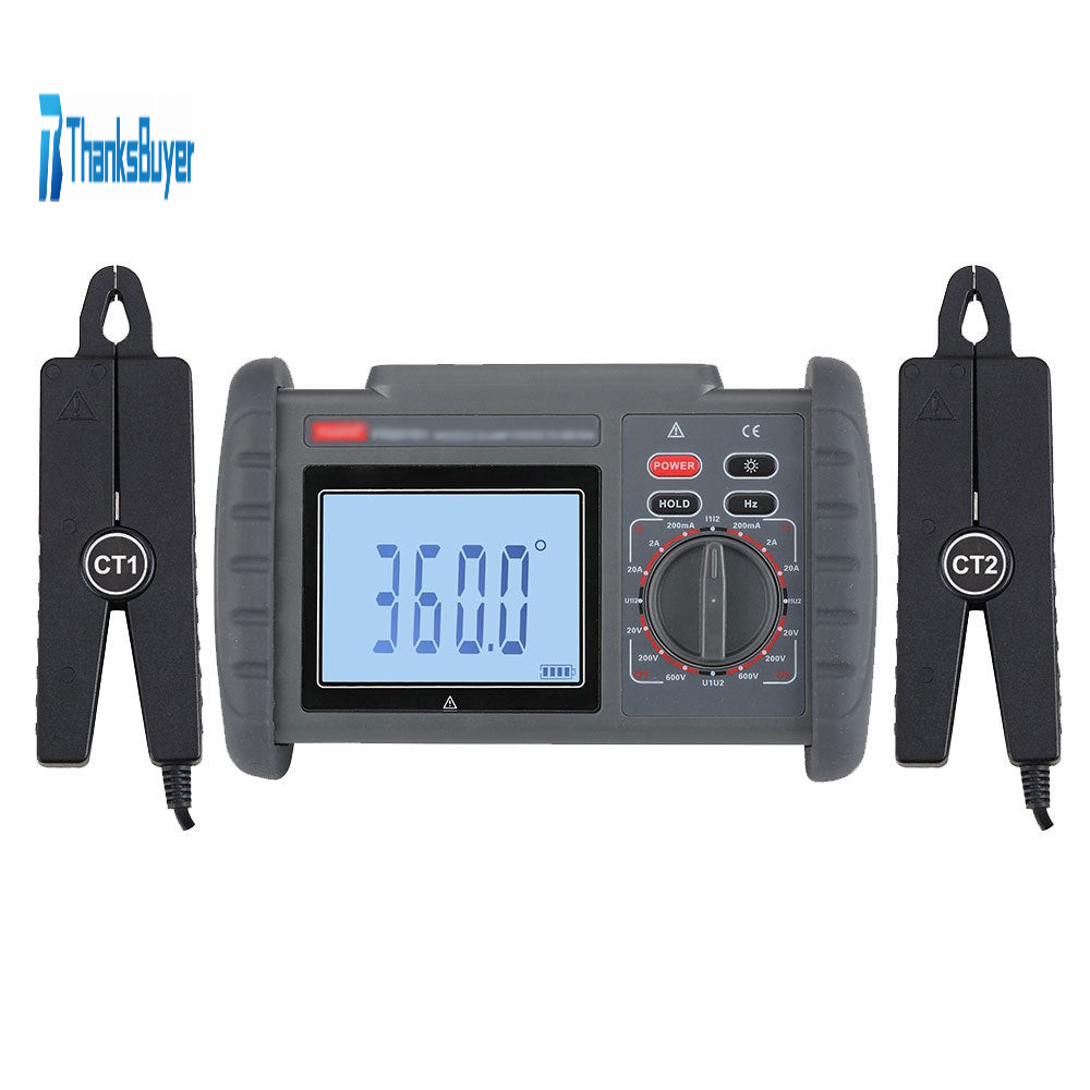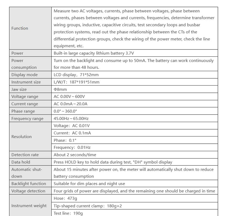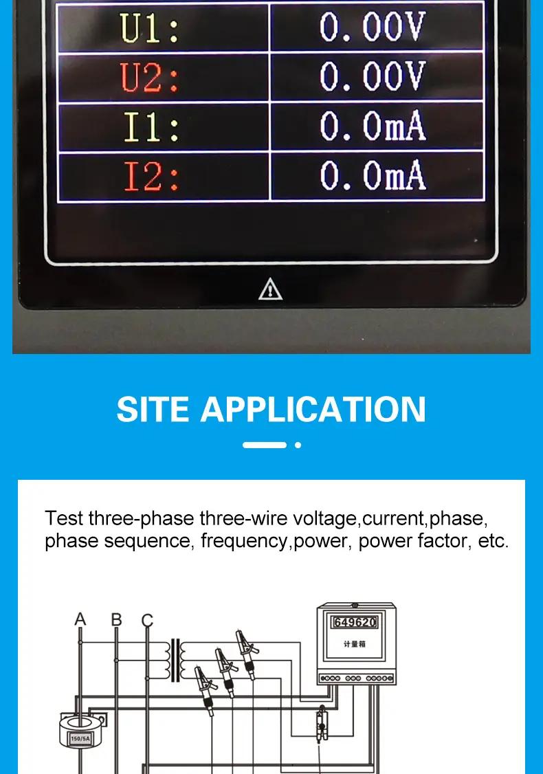 - Digital double clamp phase volt-ammeter is the latest product of our company's clamp-type meter series. It is a hand-held, dual-channel input all-digital, multi-function, high-precision, intelligent multi-parameter frequency measurement instrument. The instrument uses the latest microprocessor technology and digital signal processing technology to achieve power frequency measurement (such as voltage, current RMS, active power, reactive power, apparent power, power frequency, power factor, phase relationship, etc.), determine the transformer wiring group, inductive, capacitive circuit, test the secondary circuit and bus differential protection system, read out the phase relationship between the differential protection CT groups, check the power meter wiring is correct or not, the meter uses the clamp-type current transformer conversion method to input the measured current, so there is no need to disconnect the circuit under test. Provide a safe, accurate, and convenient new type of power meter for electricity inspection personnel.