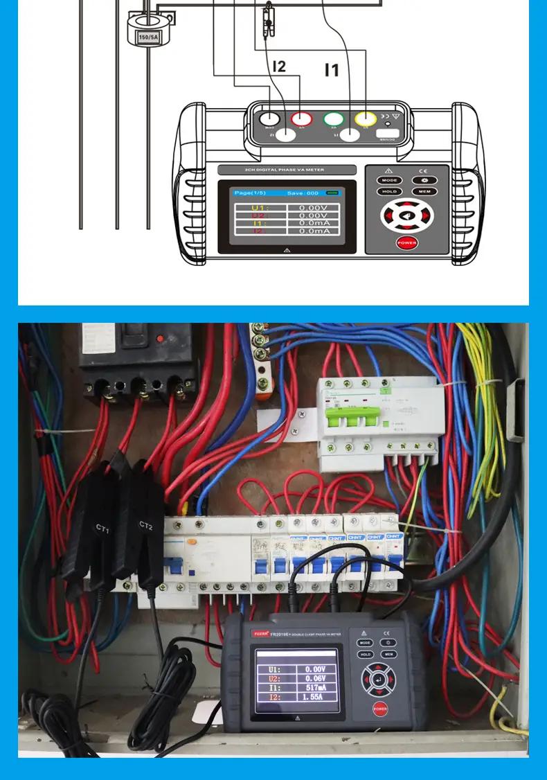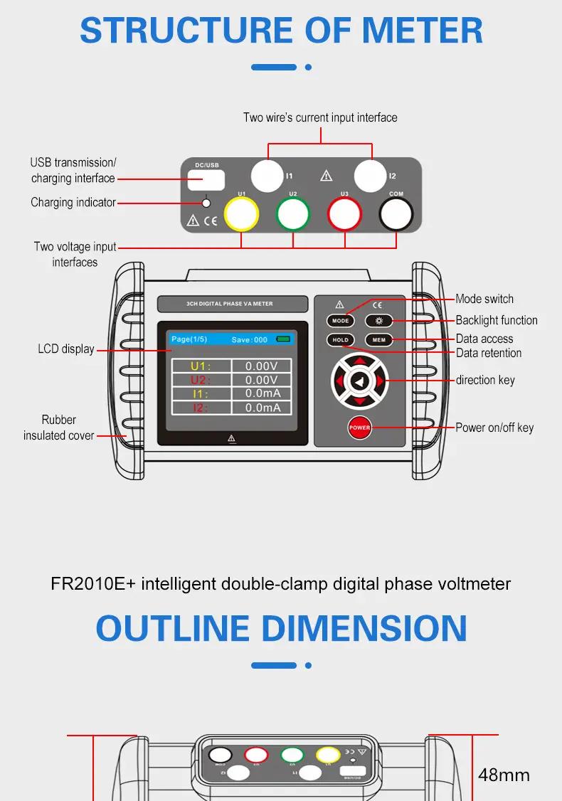 FR2010E+ 0-600V 0-20A Intelligent Double Clamp Digital Phase Volt-ampere Meter Support Power Factor Measurement