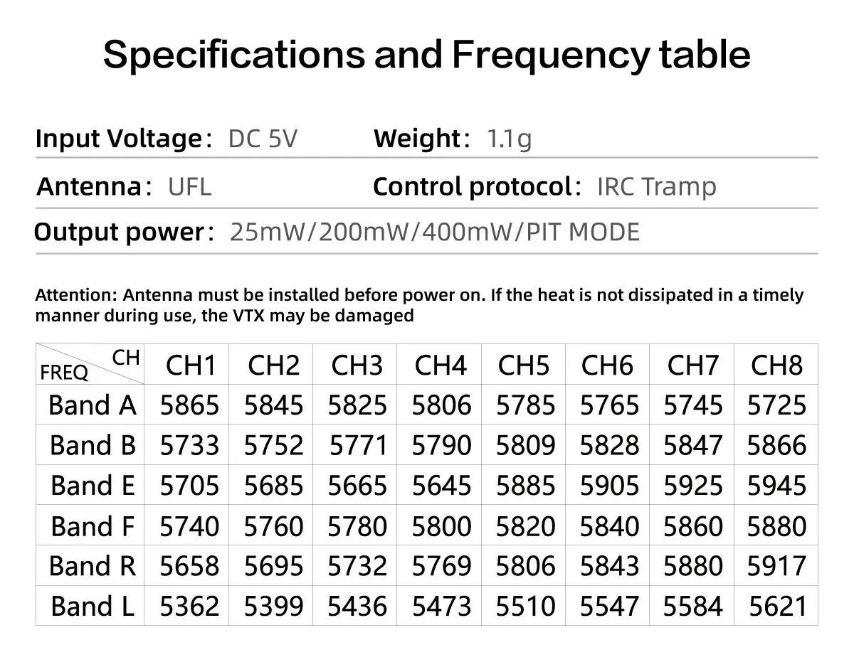- The 400mW power generates little heat and the signal is stable, suitable for medium and short distance flights.