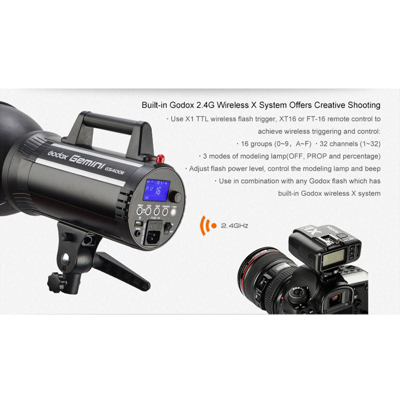With built-in Godox wireless X system, GSII series studio flash offers build quality, fine control on flash power, and stable flash output. Fit wide-range light shaping accessories in the market. It is a desirable lighting source for professional photographers to realize creative lighting effects in various subjects of photography.