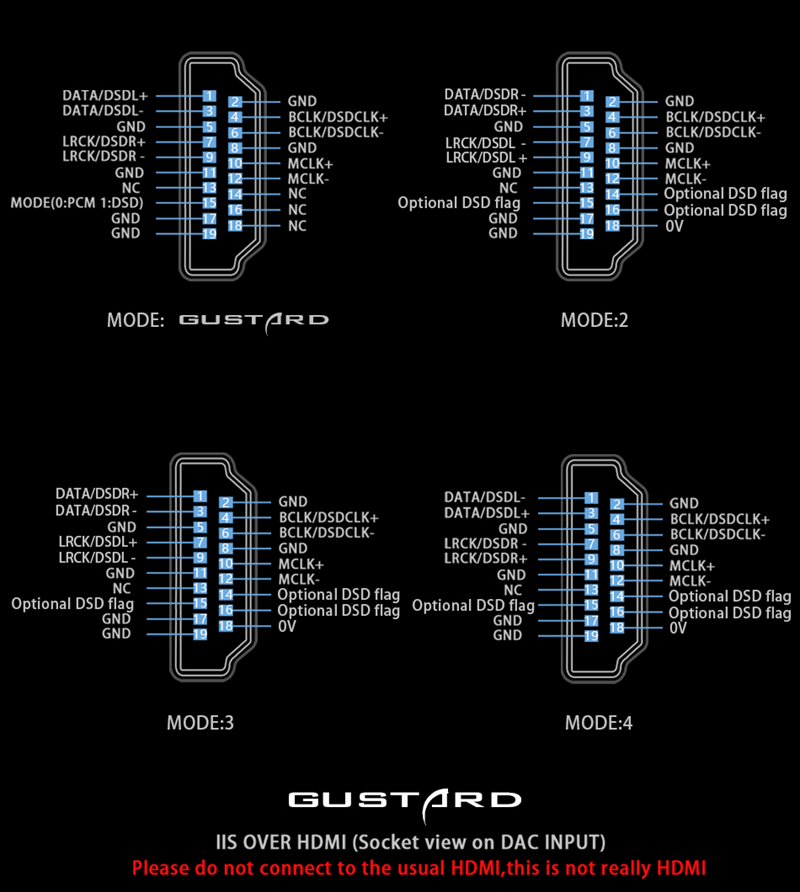 - IIS-H Ultra-high specification signal output: Four kinds of adjustable I IS line sequence, the default is GUSTARD line sequence. Short press the right button to switch the mode; long press the right button to switch the DSD flag. Please confirm the decoded line sequence and adjust to the corresponding mode, or contact customer service. IIS that is not in these 4 standards (not connected to HDMI ports of PC, TV or others) is temporarily not supported