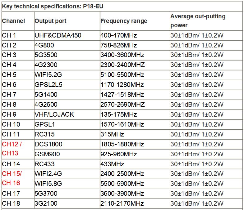 - Blocked Signal Type: P18-EU: Full Bands Mobile Phone 5G/4G/3G/2G +WiFi 2.4G/5G+ GPSL1-L5 UHF/VHF/LOJACK+RC433 315; P18-US: Full Bands Mobile Phone 5G/4G/3G/2G +WiFi 2.4G/5G+ GPSL1-L5+VHF/LOJACK+RC433 315