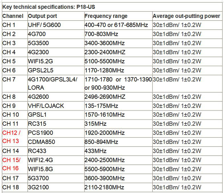 - Output Power: Total 18W; 1W each band with 2dbi gains omni antennas