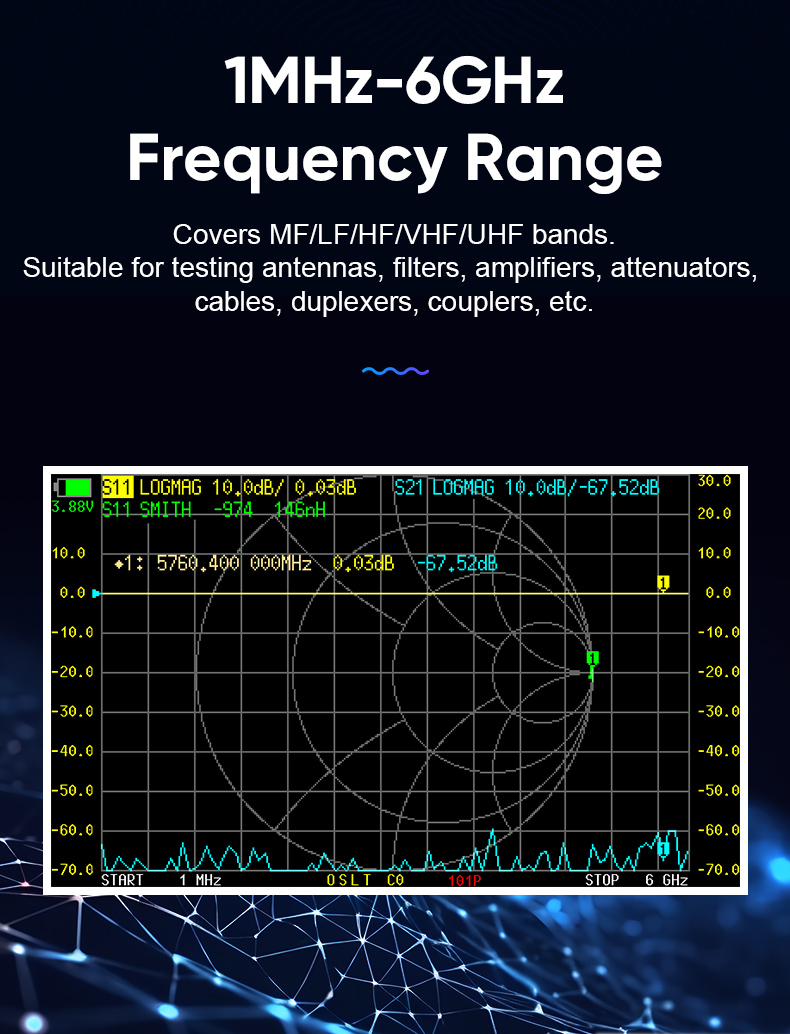 NanoVNA-F V3 is suitable for antenna testing of MF/HF/VHF/UHF/SHF bands, such as