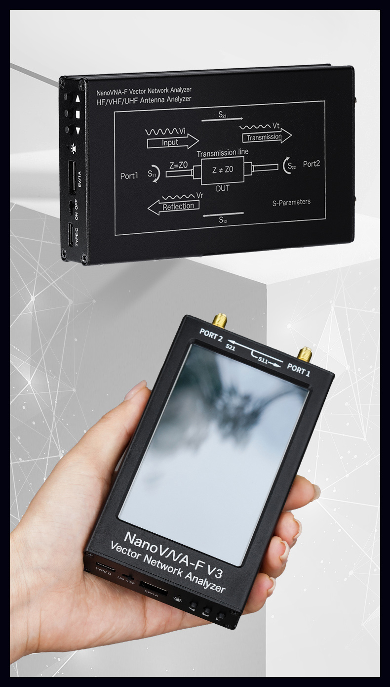 NanoVNA-F V3 is a Portable Vector Network Analyzer (VNA) with frequency range of 1MHz~6GHz. It can be used for S11 and S21 measurements. The S21 dynamic range of NanoVNA-F V3 is 65 dB, while the S11 dynamic range is 50 dB.