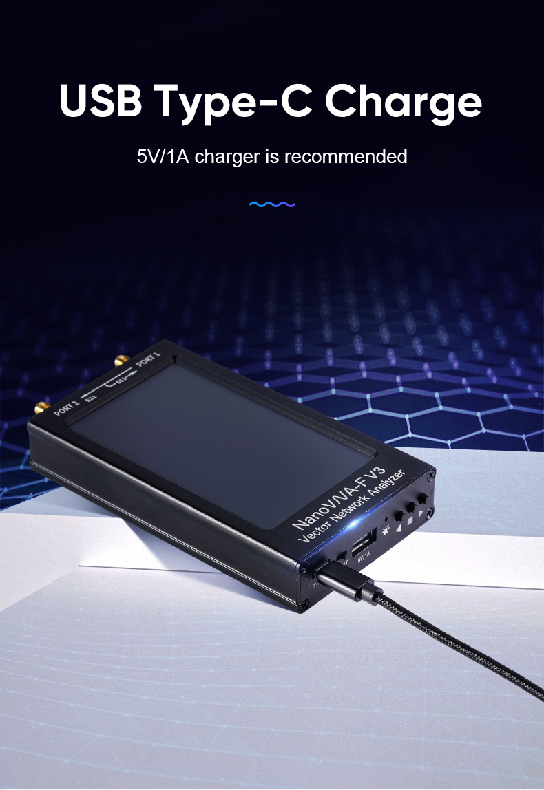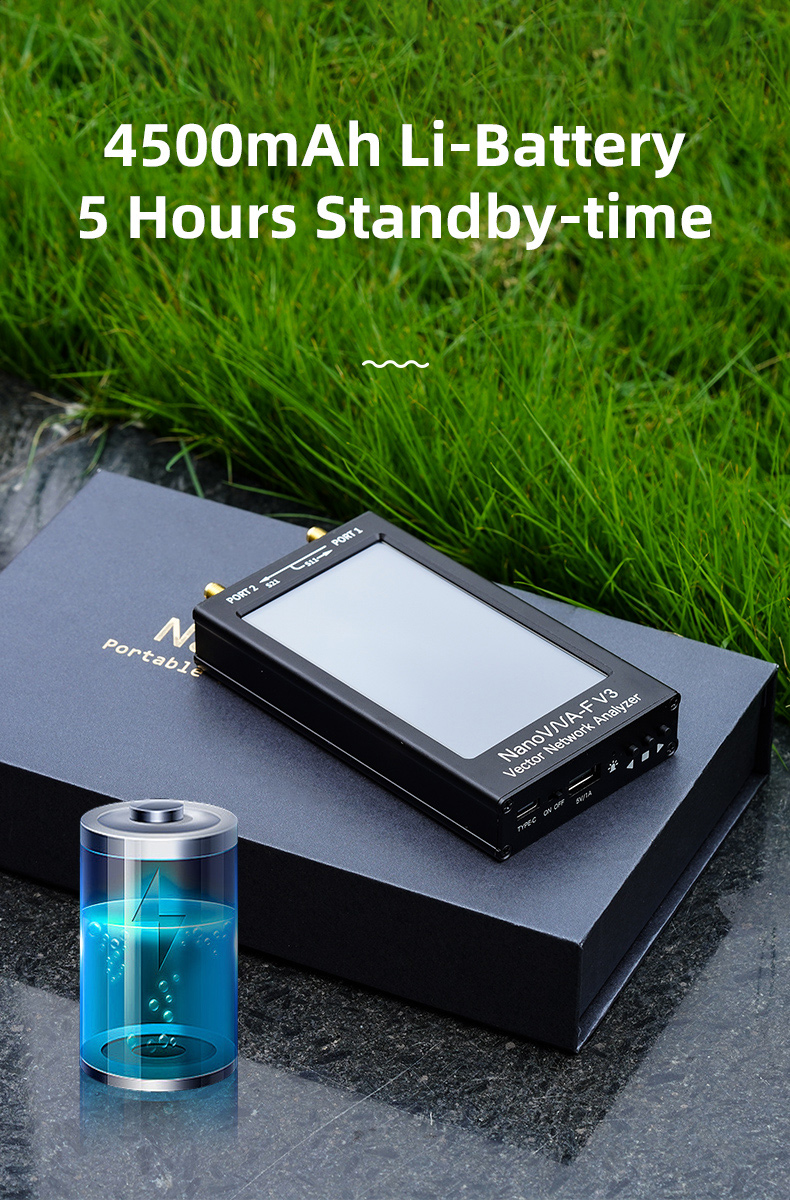 The NanoVNA-V3 has 4500mAh lithium-ion batteries with a battery life of up to 5 hours. The charging interface is USB Type-C, and the Type-C cable can be used to charge the device and also for data transfer.