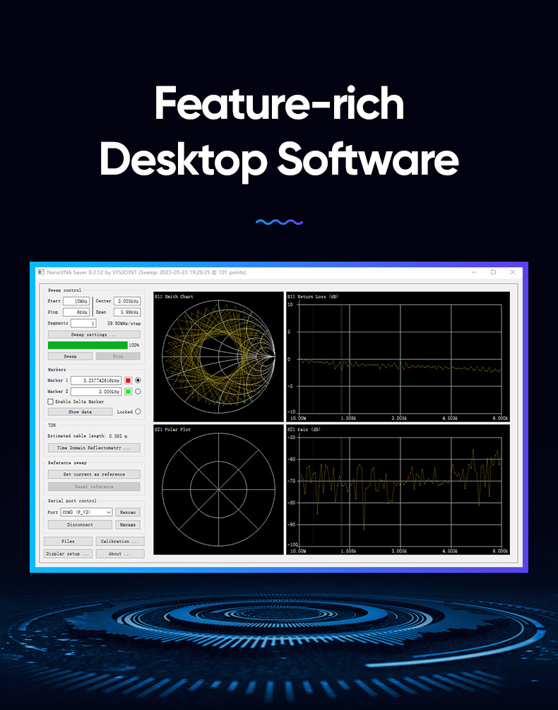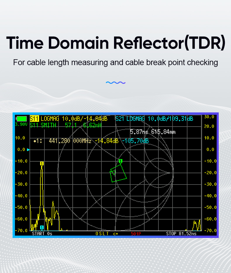 shortwave antennas, ISM band antennas, WiFi antennas, Bluetooth antennas, GPS antennas, etc. It can also be used to measure filters, amplifiers, attenuators, cables, power dividers, couplers, duplexers and other RF components. NanoVNA-F V3 supports a variety of display formats: Log Mag, Linear Mag, Phase, Smith R+jX, Smith R+L/C, VSWR, Polar, Group delay, Resistance, Reactance, etc. In addition, NanoVNA-F V3 supports TDR function which is useful for cable lengths measurement.