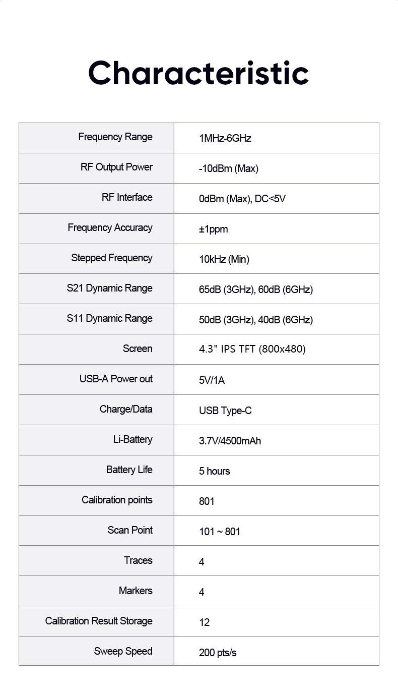 - Comes with SMA calibration kit and 2 x 20cm/7.9" SMA-JJ RG405 coaxial cable