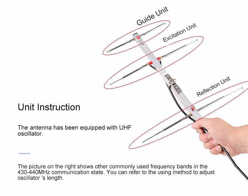 This antenna has been equipped with UHF antenna oscillator, the oscillator unit near the grip is the reflection unit, the middle oscillator unit is the excitation unit, and the oscillator unit far from the grip is the guide unit. After taking out the antenna, unfold the main beam and hold the grip. Adjust the length of the oscillator.