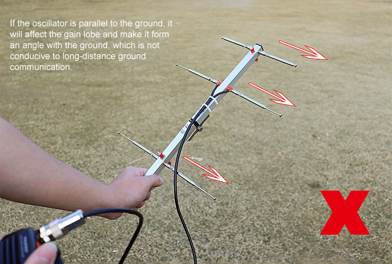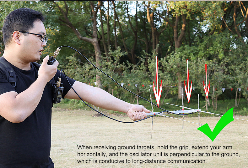 When receiving a ground target, hold the grip, extend the arm horizontally, and the oscillator unit is perpendicular to the ground. If the oscillator is parallel to the ground, it will affect the gain lobe and make it form an angle with the ground, which is not conducive to long-distance ground communication. If you use an adapter to extend the feeder, please adjust the length of the oscillator as appropriate.