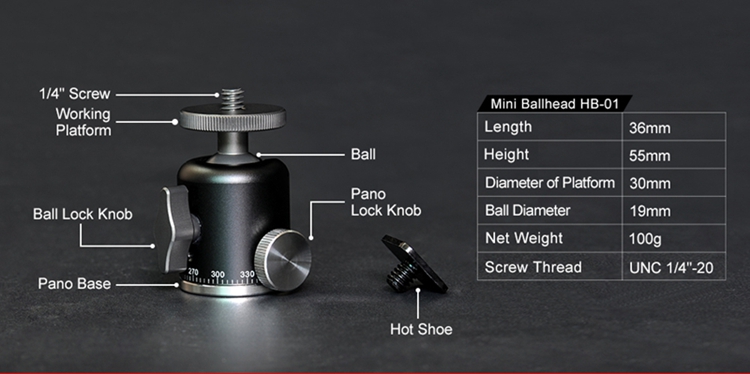 HB-01 Mini Ball Head Camera Mount All Metal with Hot Shoe For Camera Tripod Photo Studio Photographer