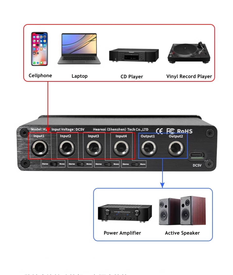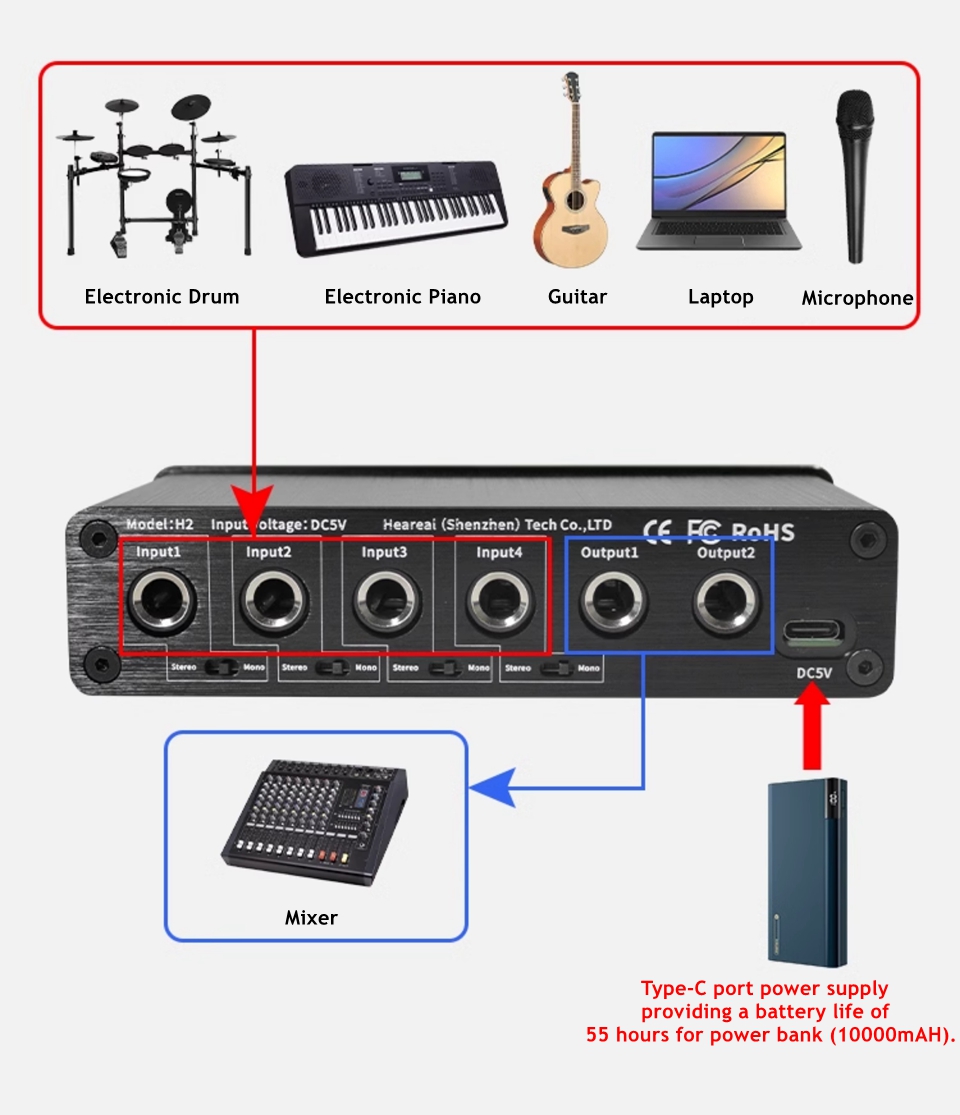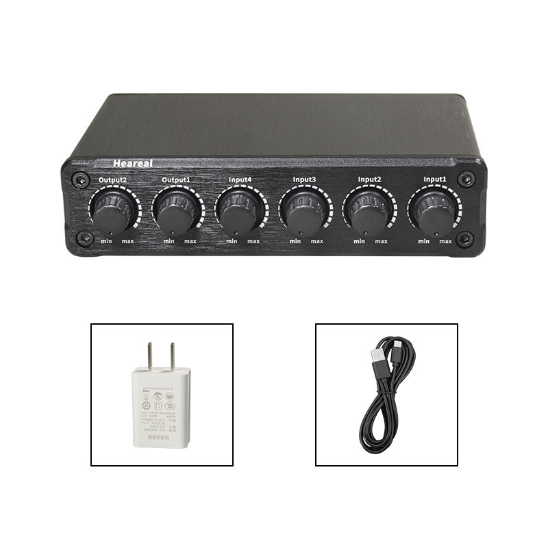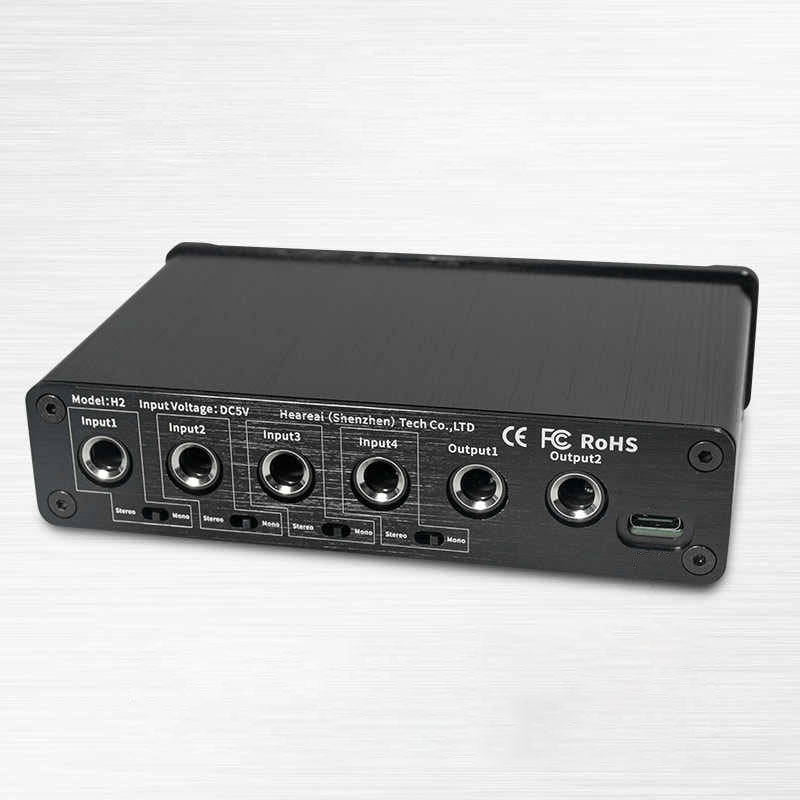 Heareal H2 4 IN 2 OUT Audio Mixer 6.5mm Interface Mono/Stereo Switch Guitar Reverb Effector Audio Distributor