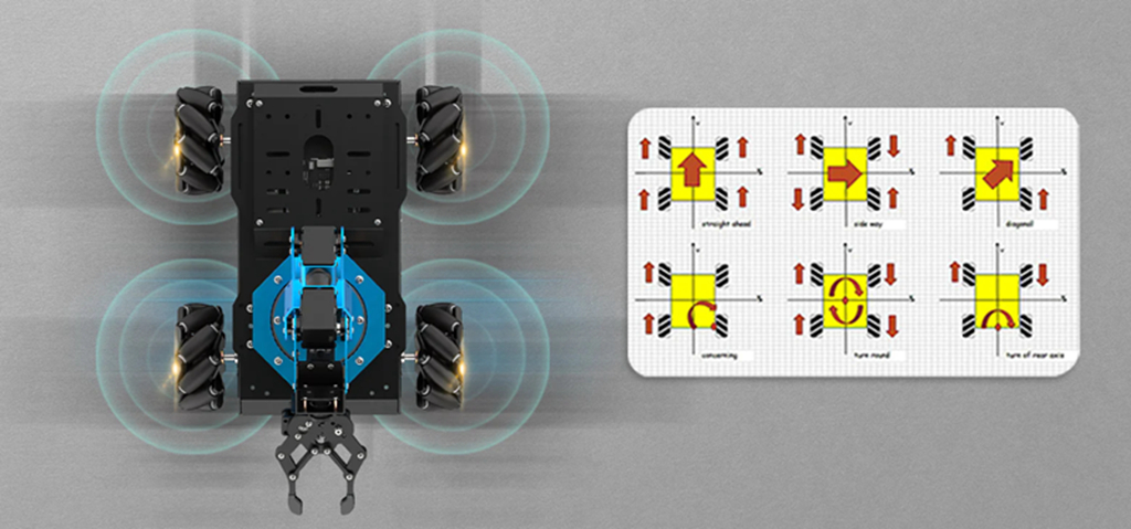 With 4 high-performance encoder geared motors and 4 omni-directional mecanum wheels, ArmPi Pro can realize 360° movement. Different movement modes (move forward, horizontally, diagonally and rotate) and excellent performance make it bold to challenge various complicated routes.