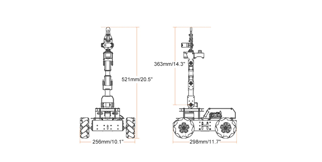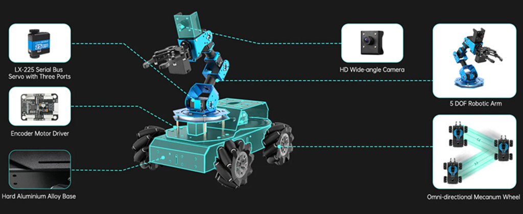 Removable mecanum wheels car makes it flexible to switch between two models, desktop robotic arm and mobile robotic arm. With ample tutorials and open source Python codes, ArmPi Pro is a perfect platform where you can learn ROS, robot technology and robot vision, curtail the project development period and fully experience AI!