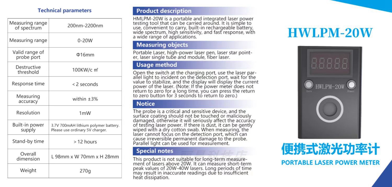 - HMLPM-20W is a portable and integrated laser power testing tool that can be carried around. It is simple to use, convenient to carry, built-in rechargeable battery, wide spectrum, high sensitivity, and fast response, with a wide range of applications.