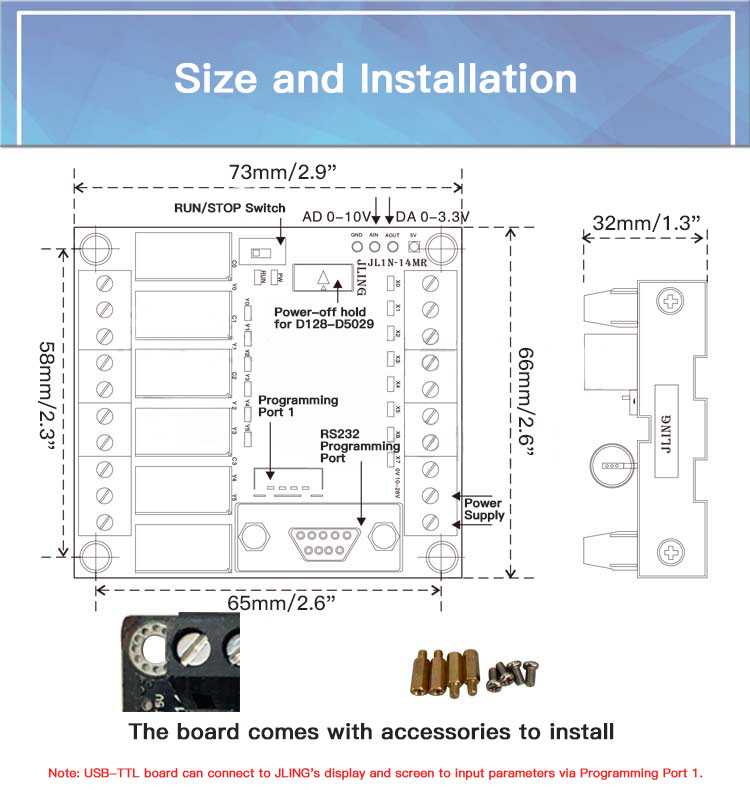 This PLC series has 2 independent 232 serial ports, one is RS232 9pin port (2: TXD, 3: RXD, 5: GND), the other is TTL 4pin port (1: GXD, 2: TXD, 3: RXD, 4: 5V). These two ports are programmable and connected to a touch screen. When programming, the 9pin port uses a USB-232 line; the 4pin port uses a USB-TTL line. When connecting a touch screen, the RS232 9pin port uses a 9pin male-to-female wire to connect the touch screen (actually only 3 wires are used, namely 2-2, 3-3, 5-5). The 4pin port of TTL level needs to use JLING's TTL to 232 conversion board to convert to 232 level before connecting to the touch screen.