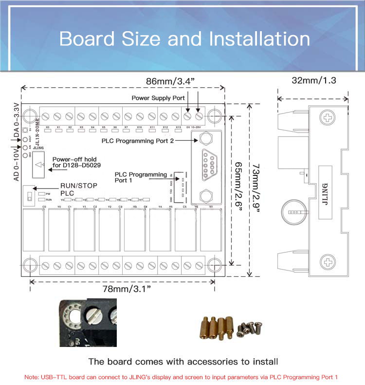 This PLC series has 2 independent 232 serial ports, one is RS232 9pin port (2: TXD, 3: RXD, 5: GND), the other is TTL level 4pin port (1: GXD, 2: TXD, 3: RXD, 4: 5V). These two ports are programmable and connected to a touch screen. When programming, the 9pin port uses a USB-232 line; the 4pin port uses a USB-TTL line. When connecting a touch screen, the 232-level 9pin port uses a 9pin male-to-female wire to connect the touch screen (actually only 3 wires are used, namely 2-2, 3-3, 5-5). The 4pin port of TTL level needs to use JLING's TTL to 232 conversion board to convert to 232 level before connecting to the touch screen.