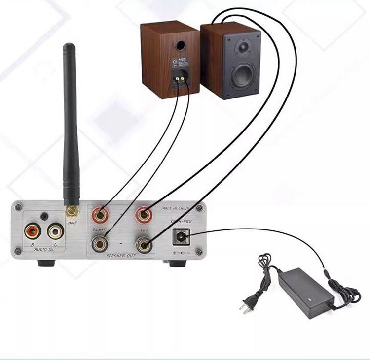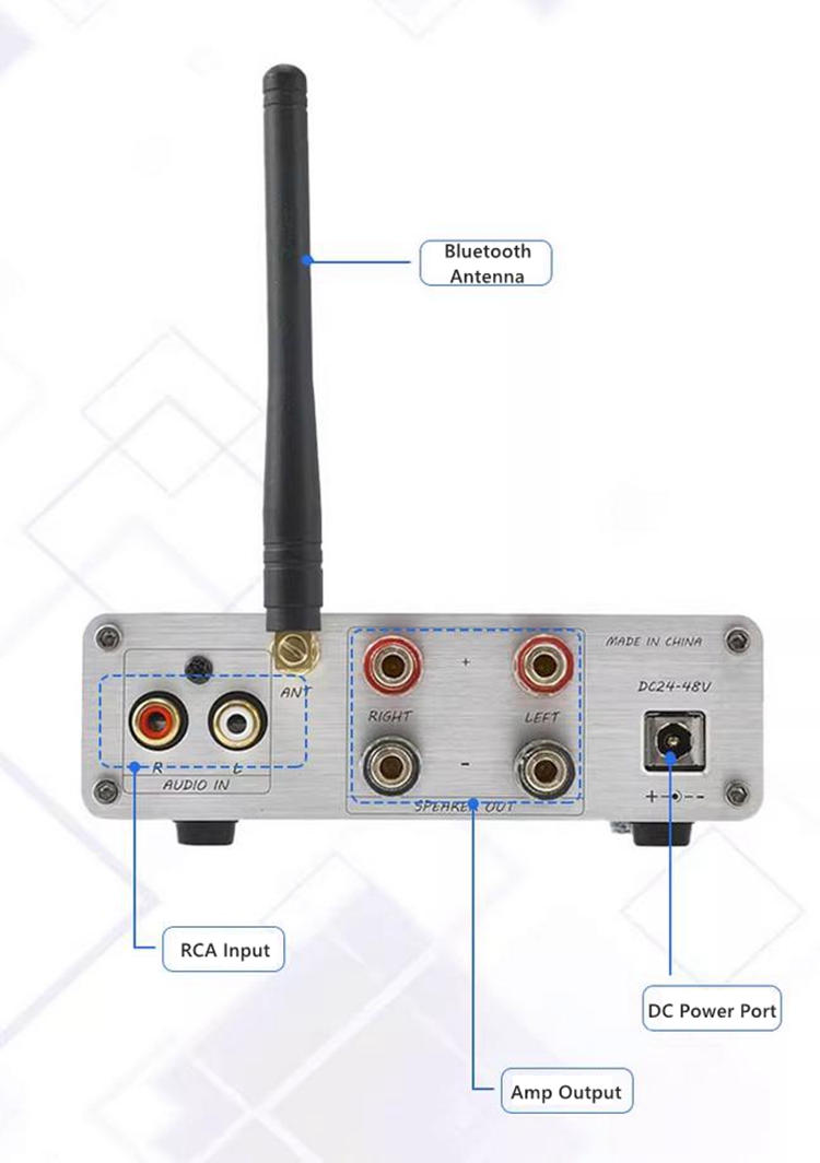 - D325B use DC24-48V power supply, the higher the voltage, the higher the power, but it can not exceed 48V, otherwise it will burn the amplifier, power plug 5.5 x 2.5, inside positive and outside negative.