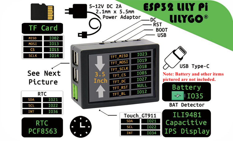 - LCD: 3.5-inch capacitive touch screen IPS ILI9481 GT911