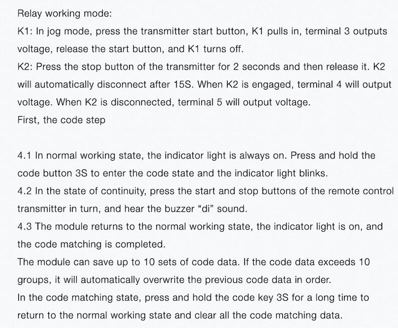 The diesel remote control receiving module GSR2P10 is specially designed for remote starting and remote stopping of diesel engines and gasoline engines similar applications. The module uses a wide voltage DC/DC power chip and a single chip microcomputer design, so it has a wide working power voltage range (12V/24V universal), easy pairing (can pair multiple remote control transmitters and multiple remote controls) , reliable operation, etc.