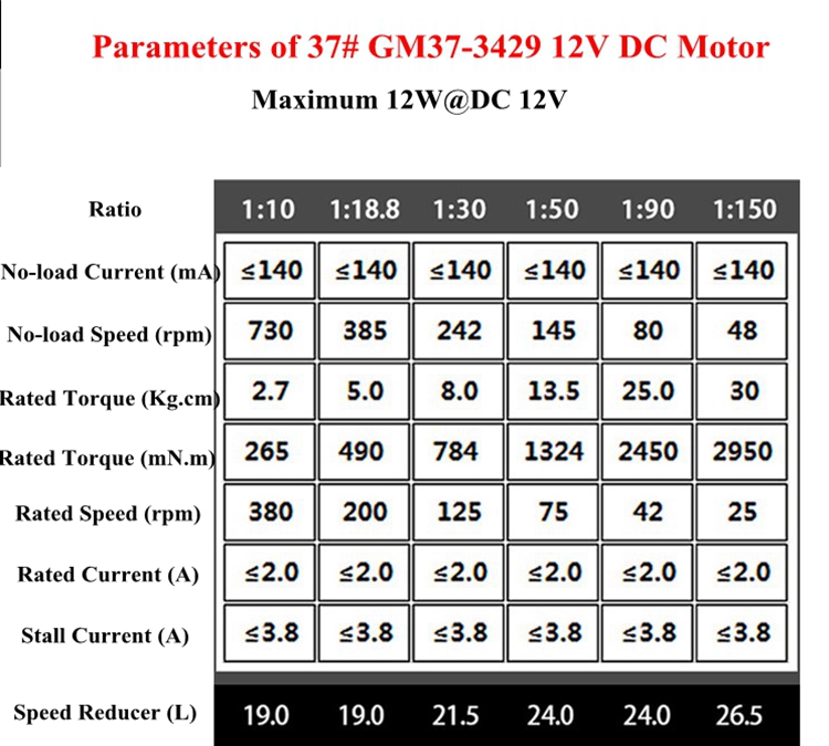 - Motor: 37# GM37-3429 12V DC Motor with Hall Encoder