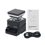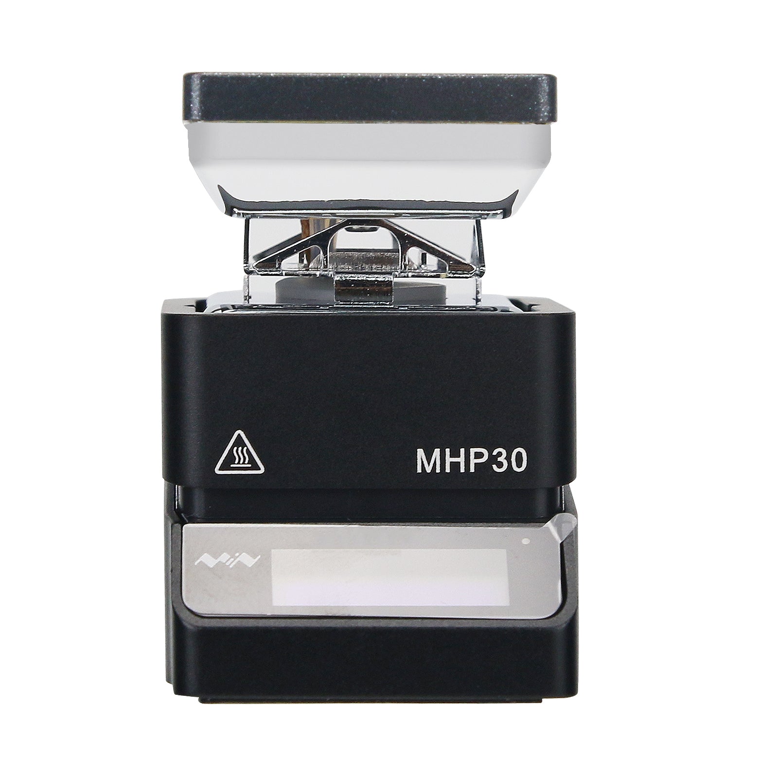 MHP30 has a small and exquisite appearance, with a square tower shape and a total height of only 5.2cm (2 inches). MHP30 controller and hot plate can be flexibly separated and replaced. The controller is equipped with an OLED display and two physical buttons (on the back). A pair of support feet at the bottom can be spread out to better support the whole station. The hot plate's heating body is made of brass with nano-ceramic coating, smooth on surface and evenly heated. A futuristic stainless steel hollow bracket connects the heating part with the circuit board that can be directly inserted into the controller.