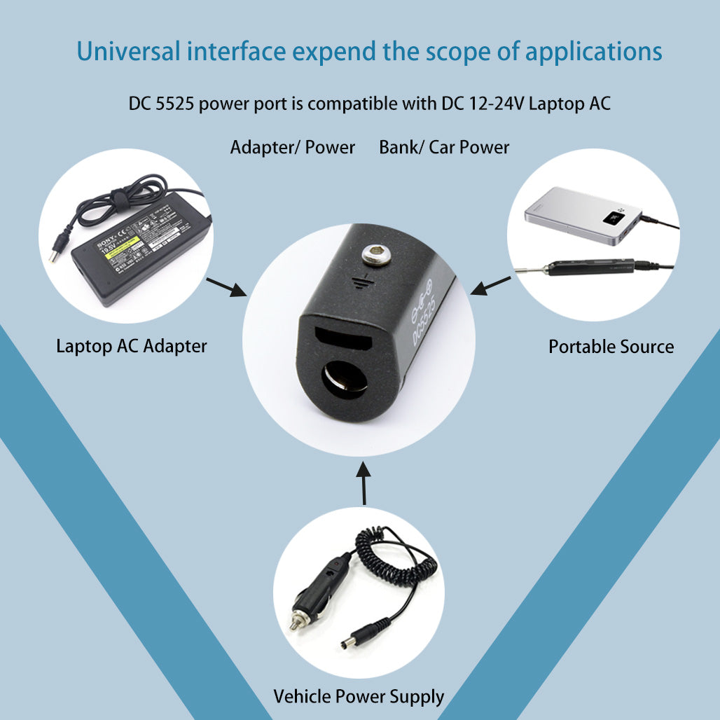 - Universal interface adapts to external power supply, expands the scope of use. Recommended DC5525 power supply interface, suitable for DC12V-24V laptop power supply, car power supply and mobile power supply.