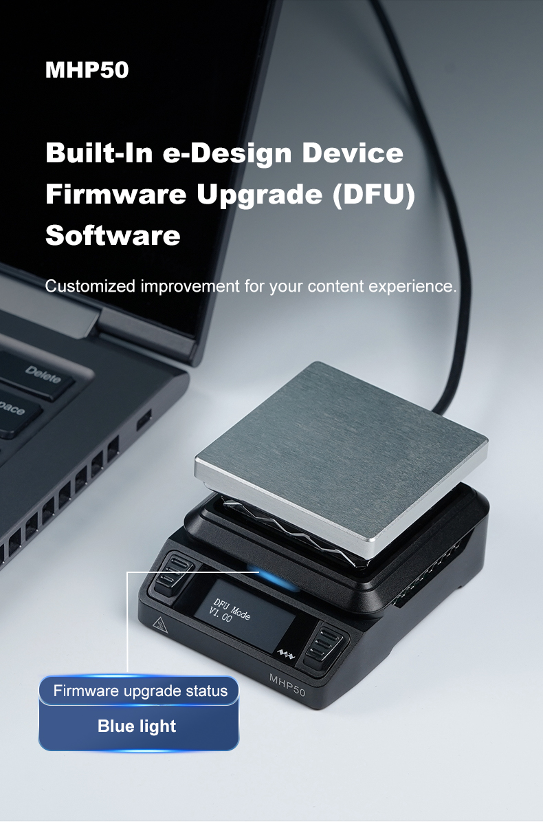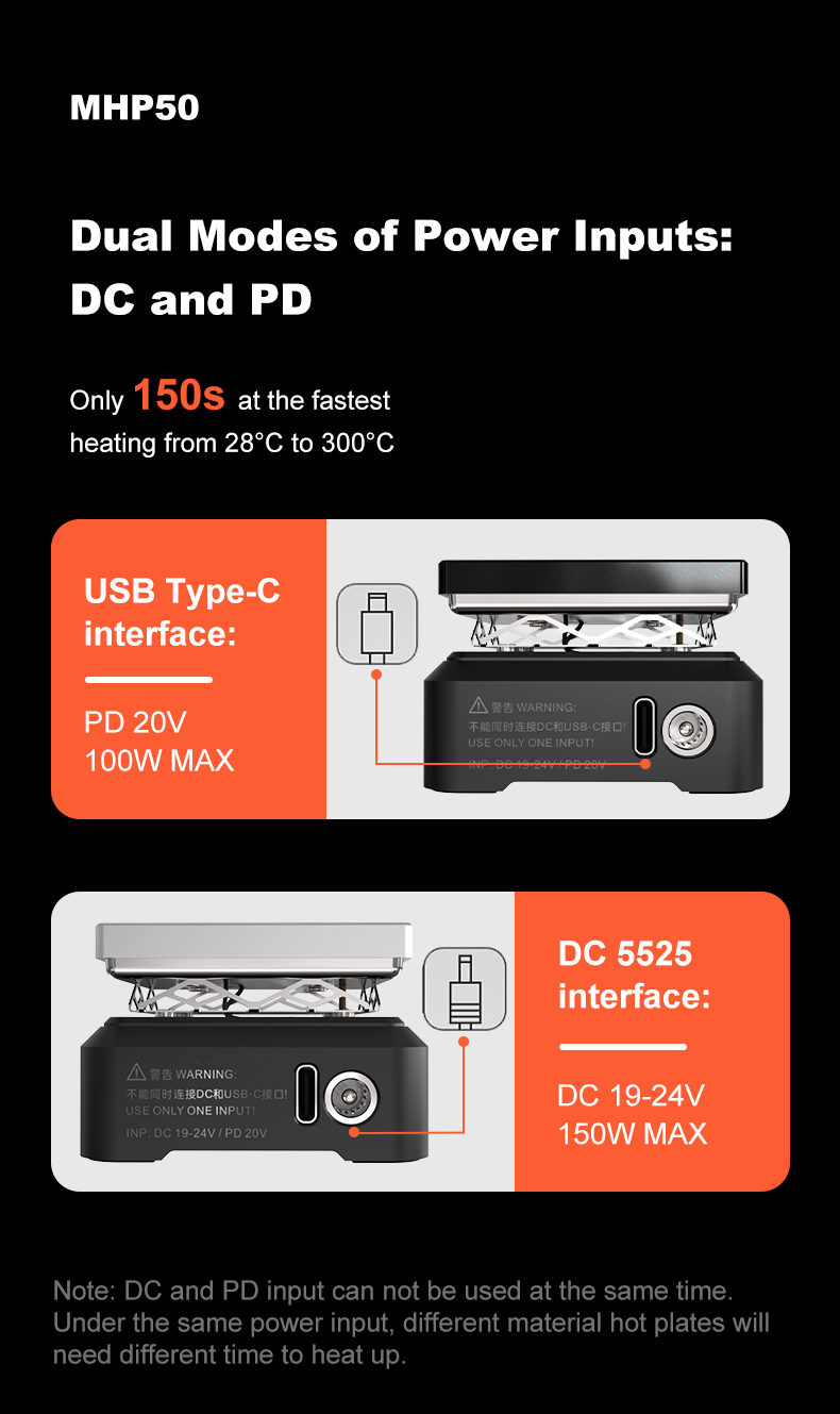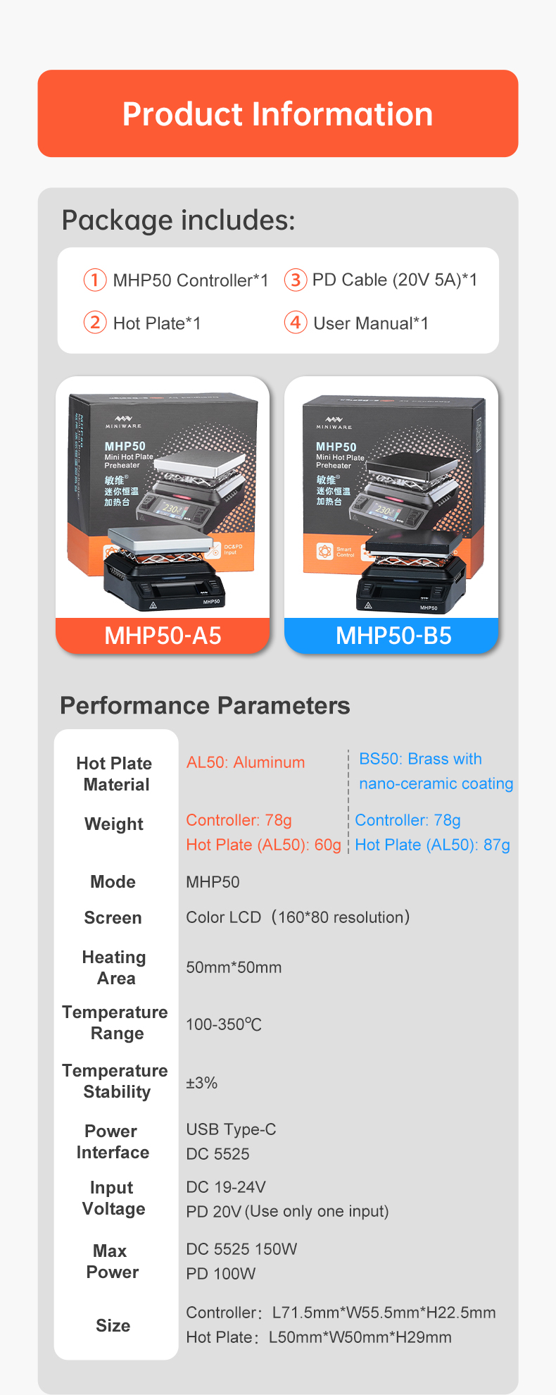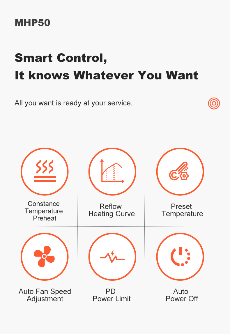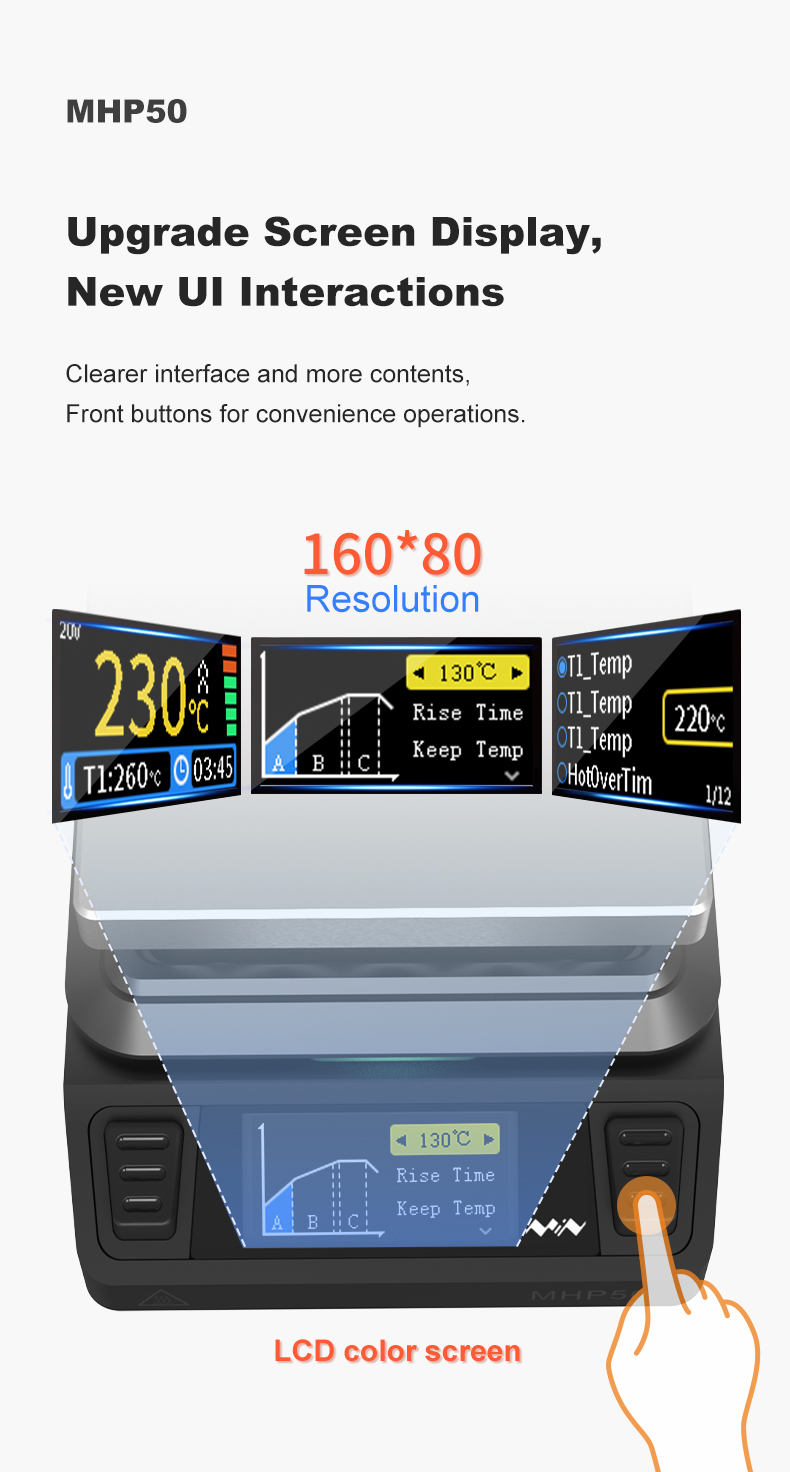 - Besides MHP30’s inheriting the true color temperature lighting and excellent thermal performance, MHP50 has other hardware and functional improvements. MHP50 supports both DC and PD input modes—under DC5525 19-24V power input, the maximum power of MHP50 can reach 150W, while under PD 20V, 100W; it takes 150 seconds heating from room temperature (28℃) to 300℃ at the fastest. In terms of firmware functions, MHP50 adds a heating curve function by which user can set different heating parameters by sections according to soldering needs to achieve a heating effect similar to that of a reflow oven. In addition, MHP50 also has intelligent functions such as preset temperature, overturn protection, brightness adjustment, firmware upgrade, etc. Users can turn on or off the corresponding functions as needed.