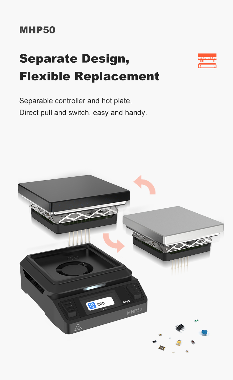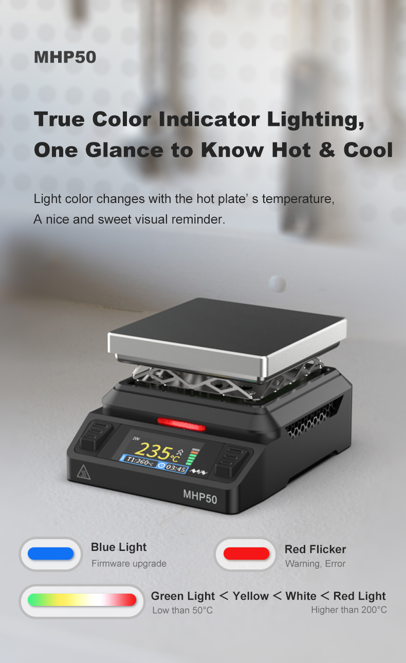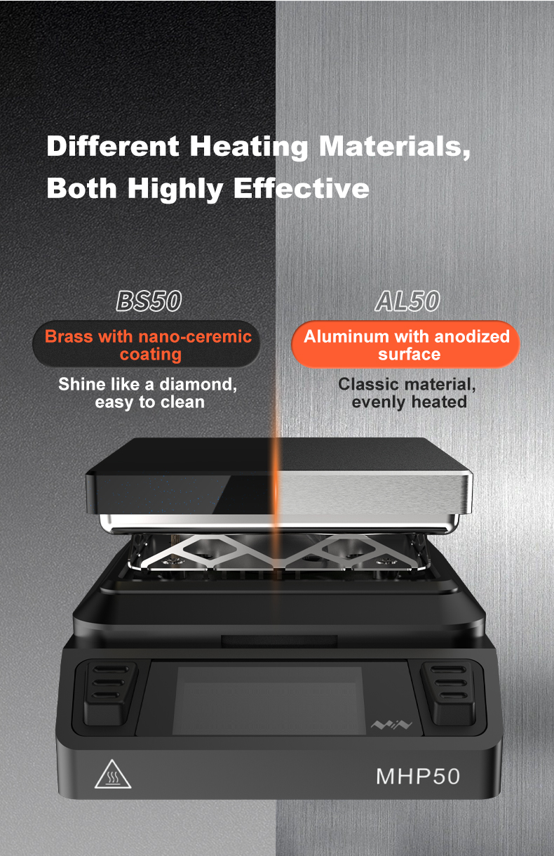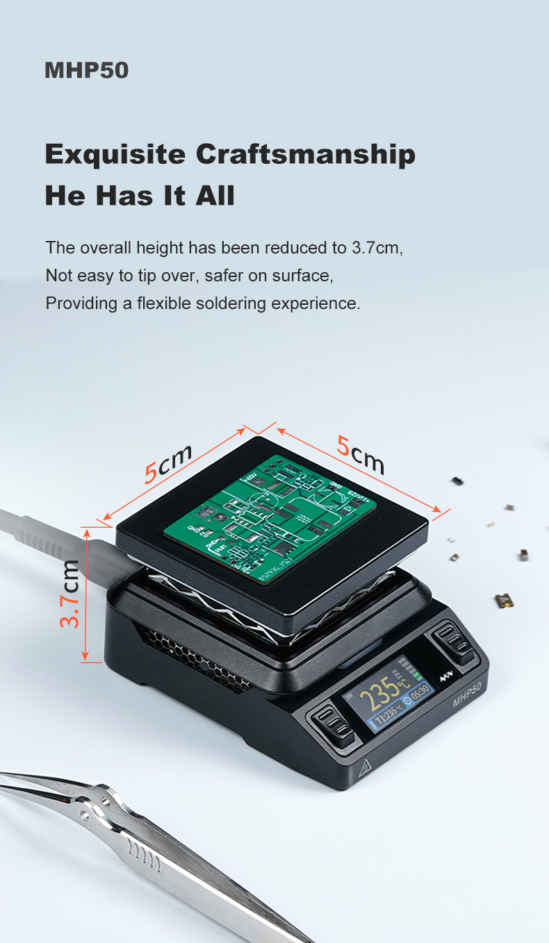- MHP50 has a flat sandwich shape and separate design that facilitates flexible replacement of controller and hot plate. MHP50 innovatively adds a high-speed cooling fan for heat dissipation that can smartly adjusts fan speed by temperature sensor and blows air to the heat filter piece of hot plate, and a unique air deflector helps deflect the hot air away with unnecessary heat, reducing the overall height of MHP50 to 3.7cm (1.46 inches), making it more stable, not easy to tip over, and more flexible in soldering operations while not affecting the overall performance. The controller is equipped with a 160x80 resolution color LCD display, which can clearly display device status. There are physical buttons on each end of the screen for quick setup. MHP50’s hot plate uses two different materials for heating body—brass plated with nano-ceramic coating, the same material as MHP30, special processed and easy to clean; aluminum alloy heating body, a classic material and evenly heated . A futuristic stainless steel hollow bracket connects the heating part with the cold end circuit board that can be directly inserted into the controller.