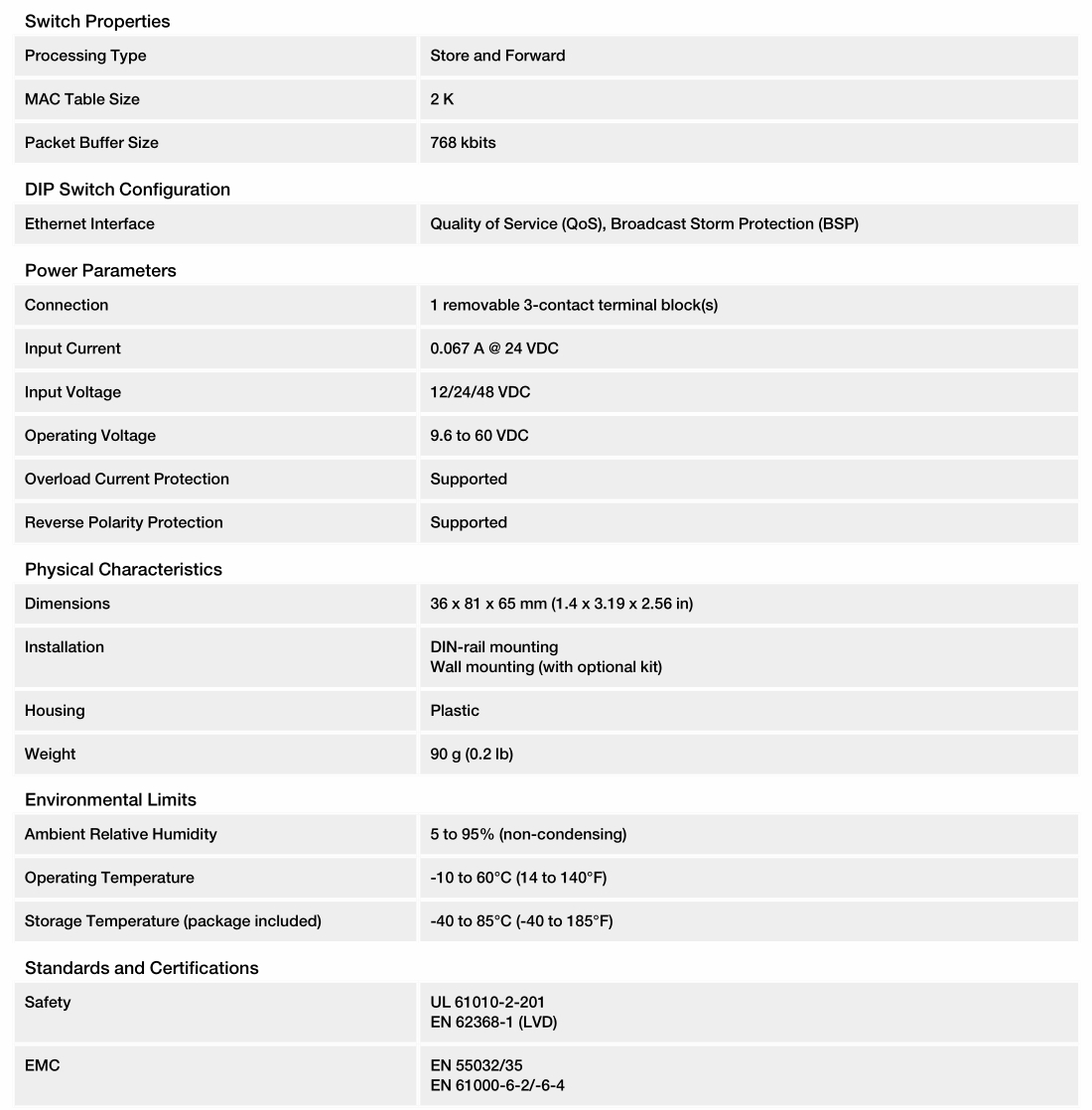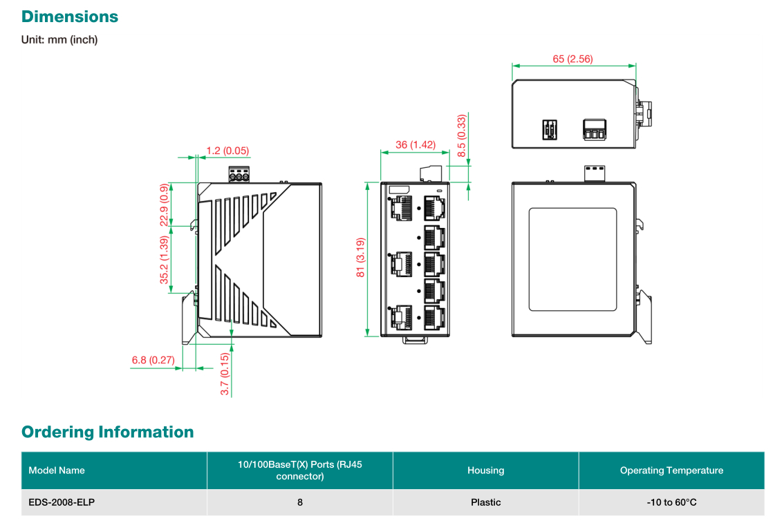 It has a 12/24/48 VDC single power input, DIN-rail mounting, and high-level EMI/EMC capabilities. In addition to its compact size, the EDS-2008-ELP has passed a 100% burn-in test to ensure it will function reliably after it has been deployed. The EDS-2008-ELP has a standard operating temperature range of -10 to 60°C.