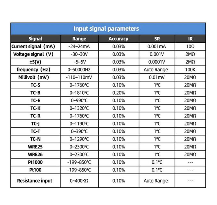 - Thermocouple: K, R, S, E, J, T, N, B, WRE25, WRE26