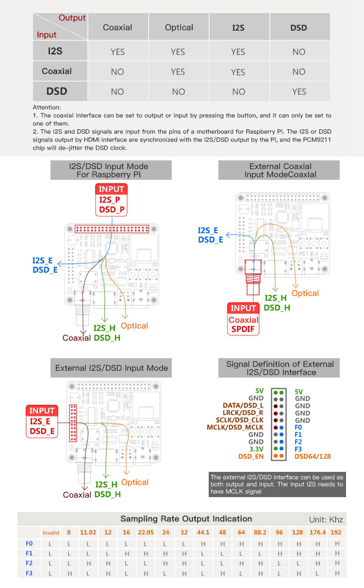 - Support I2S, DSD and coaxial input. N0 audio decoder board supports I2S and DSD digital audio signal decoding on the motherboard for Raspberry Pi. You can also set and decode external coaxial signals through the three buttons on the board
