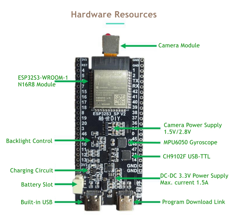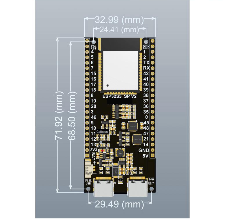 - Dual USB ports, one CH9102F, and one ESP32S3 USB port.