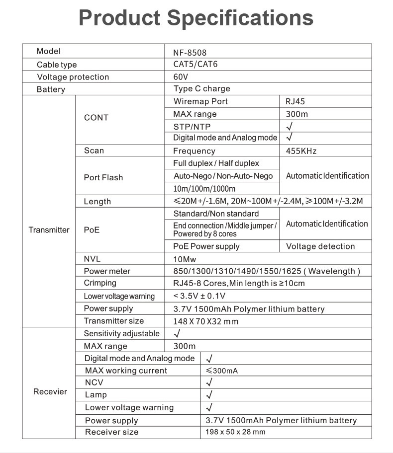 - Receiver Function: sensitivity adjustment, 300m no-load shielded network cable/non-empty shielded network cable, NCV detection, lighting function, etc.