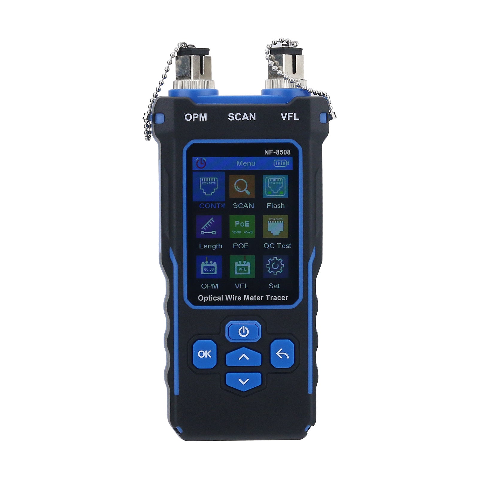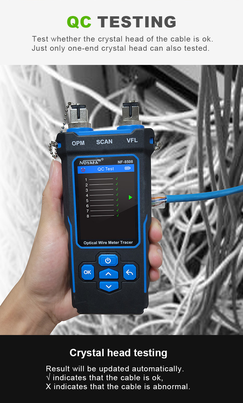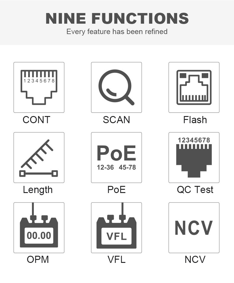 - Transmitter Testing Function: including cable continuity testing, cable scan, port flashing, cable length measurement, PoE test, QC testing for crystal head, OPM (optical power meter) and VFL (visual fault location) function.