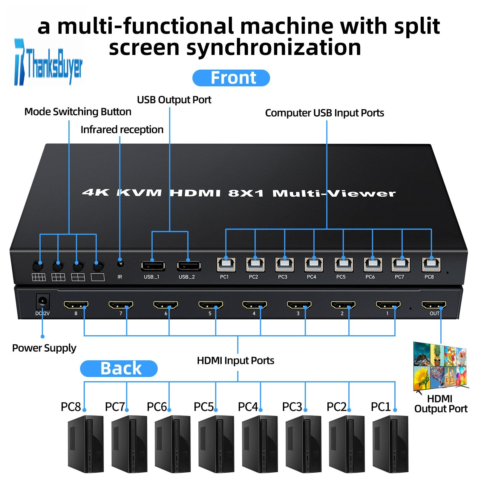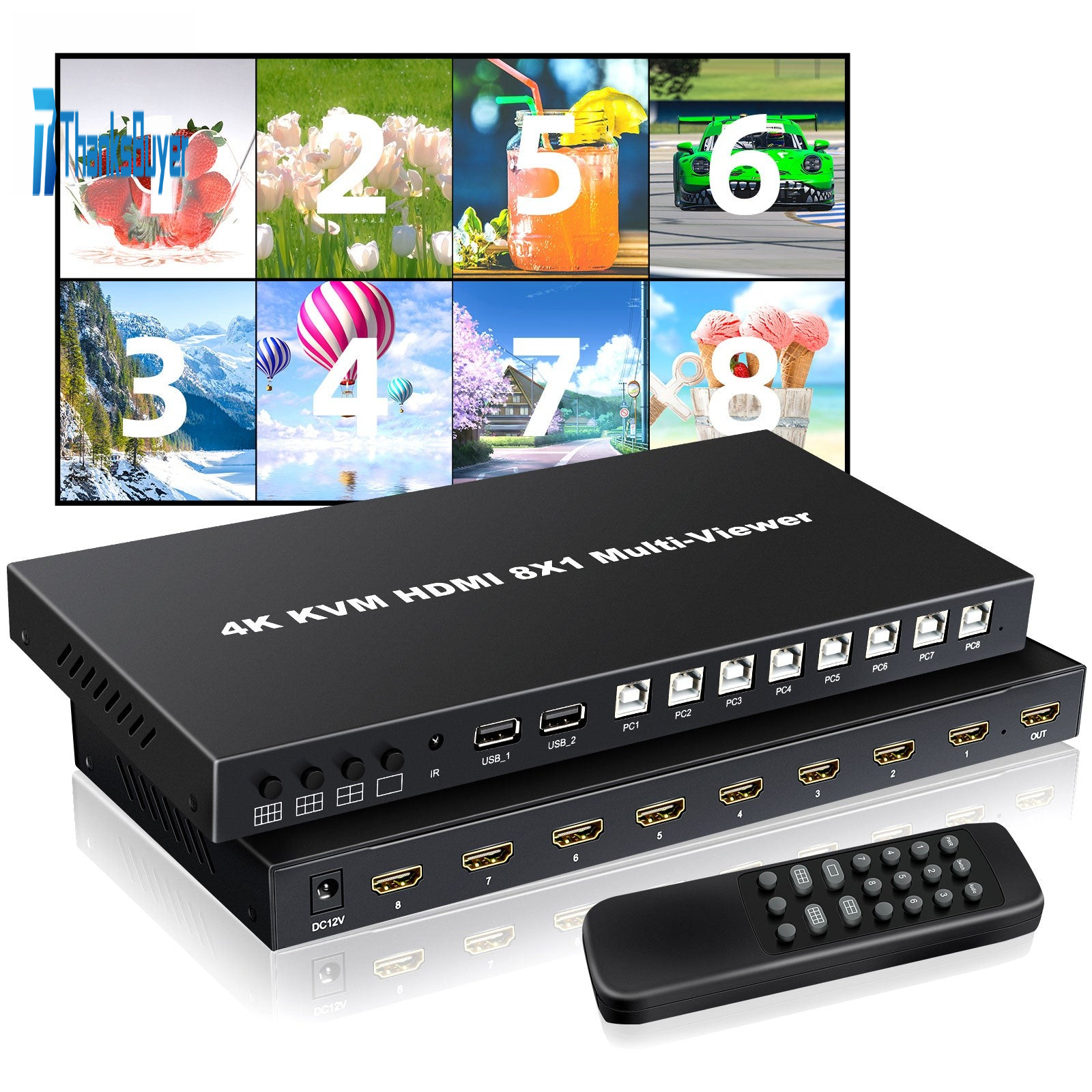 - 4K KVM HDMI-compatible 8x1 Quad Multi-viewer is a high performance with 8 HD screen segmentation and seamless switching output switch. It can display 8HD digital video signal on the same screen, and has a variety of video segmentation, seamless switching 8 HD input signal synchronously. The control methods of the switch is flexible, it can be switched via button and IR control. It’s a very practical and stable switch and easy to install, can be used in the major projects, meeting halls and other places.