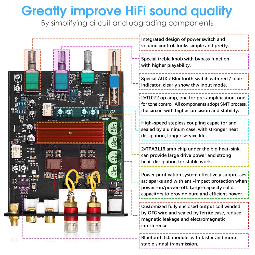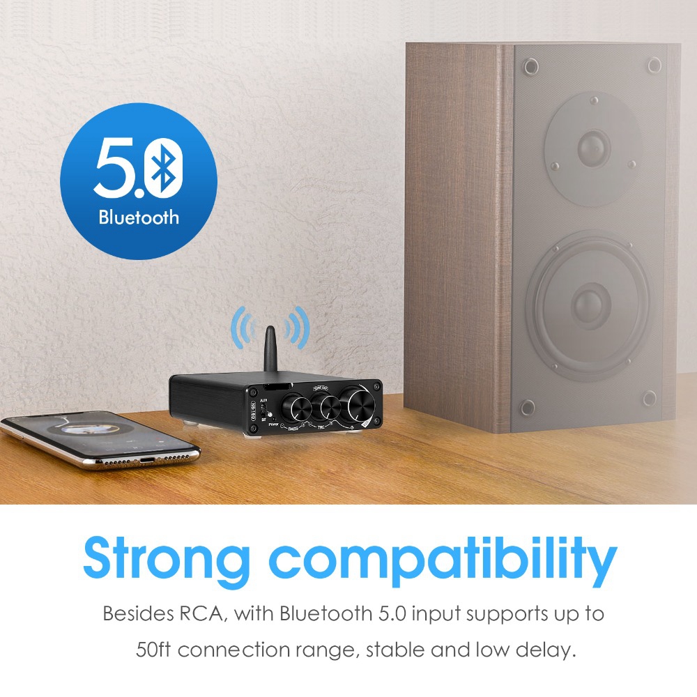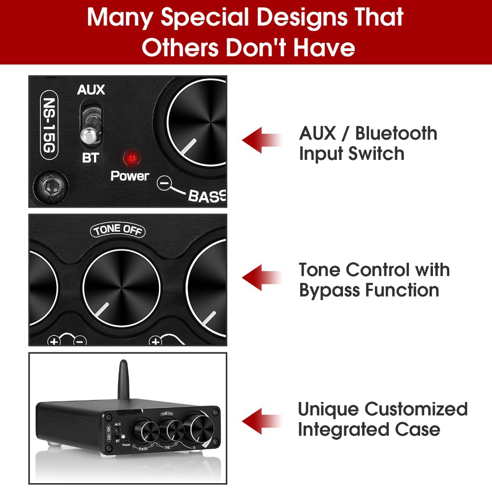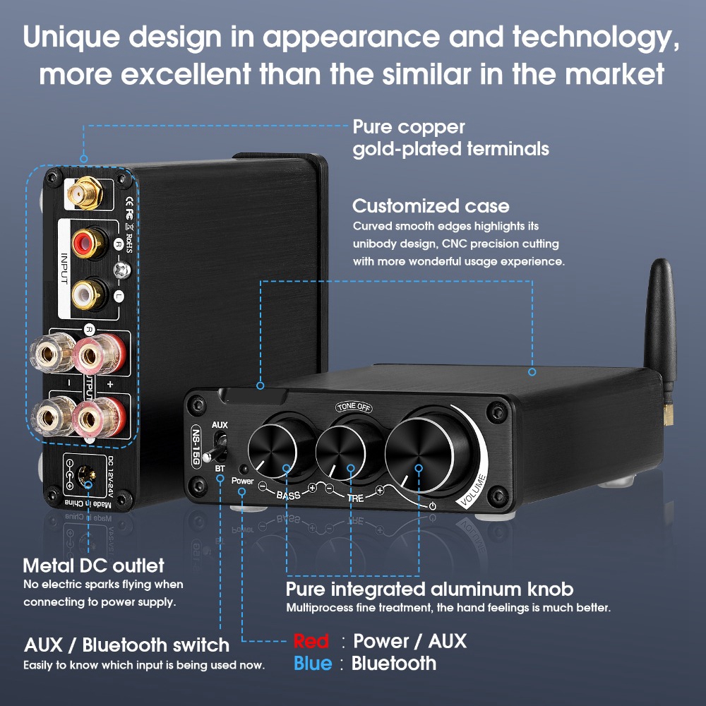 NS-15G 100W+100W Bluetooth5.0 Stereo Digital Audio Power Amplifier TPA3116 Treble and Bass Adjustment with 24V6A Power Adapter