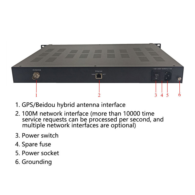 - Its rear panel with antenna port for GPS/Beidou, 100Mbps network port, switch, spare fuse, socket and grounding terminal