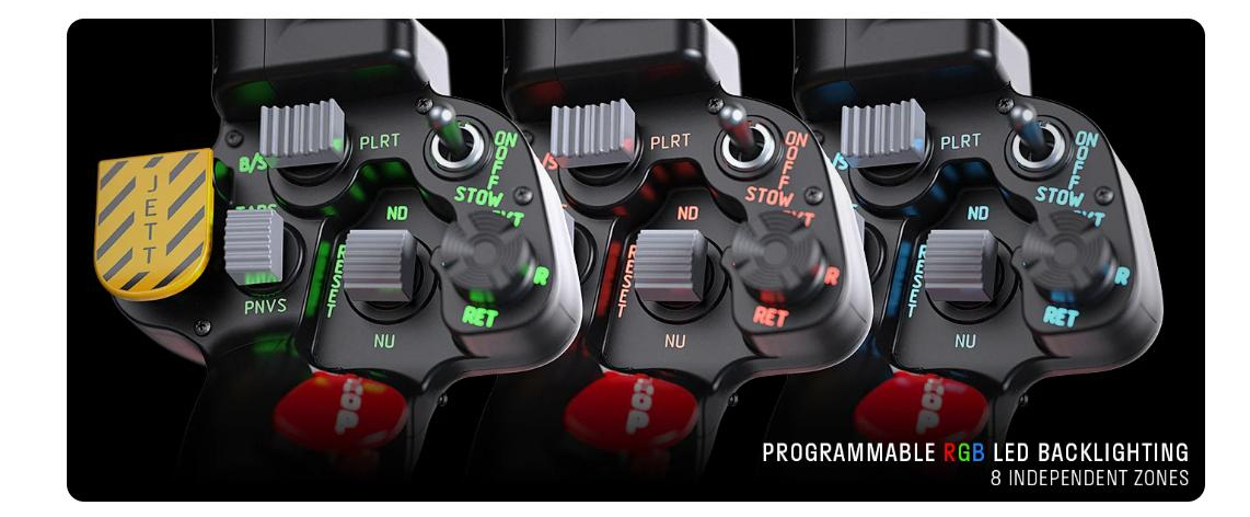 While not found on it's realworld counterpart - the VPC Apache-64 Collective Grip features a robust programmable backlighting system with 8 independent zones. Backlighting can be configured based on button/shift states, or simply to match the aesthetic of your cockpit! For those seeking ultimate realism, the backlighting can be disabled.