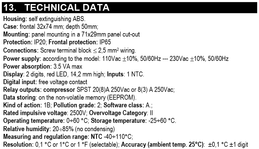 XR02CX, format 32 x 74 x 50mm/1.3 x 2.9 x 2", is a digital thermostat with off cycle defrost designed for refrigeration applications at normal temperature. It provides a relay output to drive the compressor. It is also provided with 1 NTC probe input and one configurable digital input. The instrument is fully configurable through special parameters that can be easily programmed through the keyboard or the by HOTKEY.