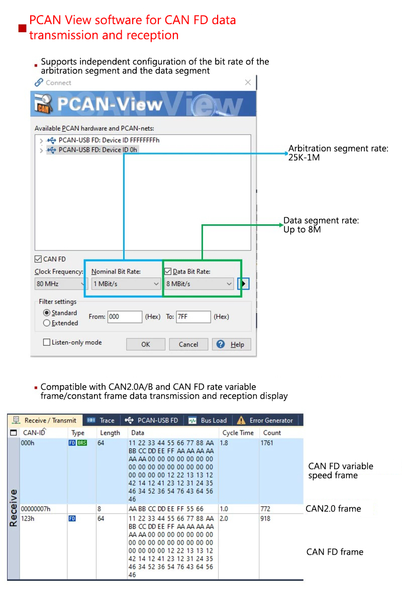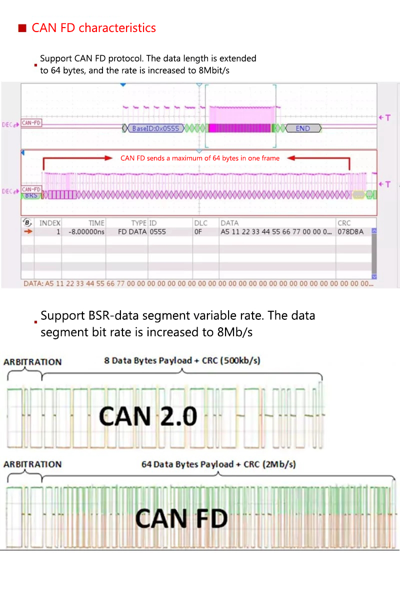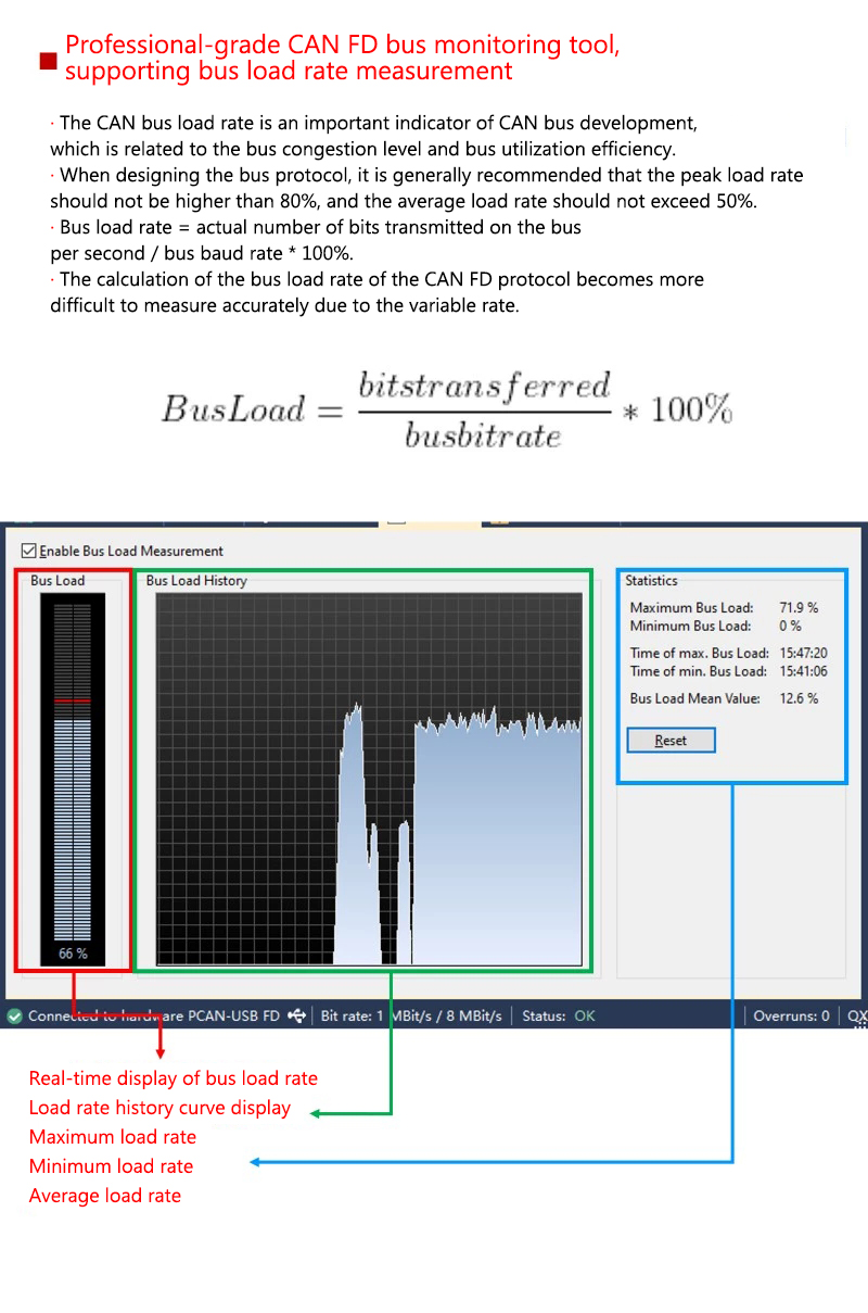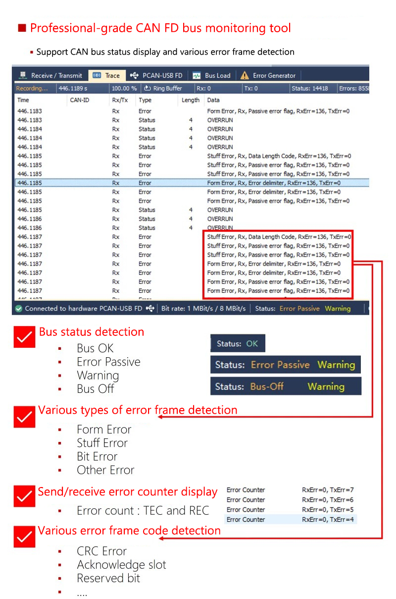 - Supports bus load measurement. Supports error frame detection and bus status monitoring
