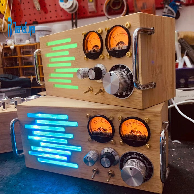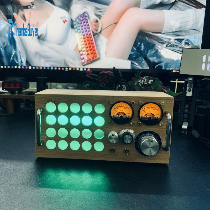 - It has a pickup microphone inside; the sensitivity of the meter needle can be adjusted. If there is a certain volume of sound around, its vu meter will jump. Now the metal rotatable button is changed to 2 as an ornament. The large metal knob is a sensitive light, and its color can be controlled by the Bluetooth app. It supports multiple color adjustments