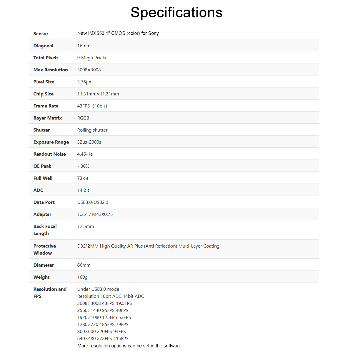 Saturn-C SQR (IMX533) camera is developed by Player One Astronomy. SQR means its sensor is square. The camera adopts an original IMX533 1" square format color sensor for Sony. The 3.76um pixel size accommodates a well depth of 73Ke with a total of 9MP (the resolution is 3008*3008), and the diagonal is 16mm.