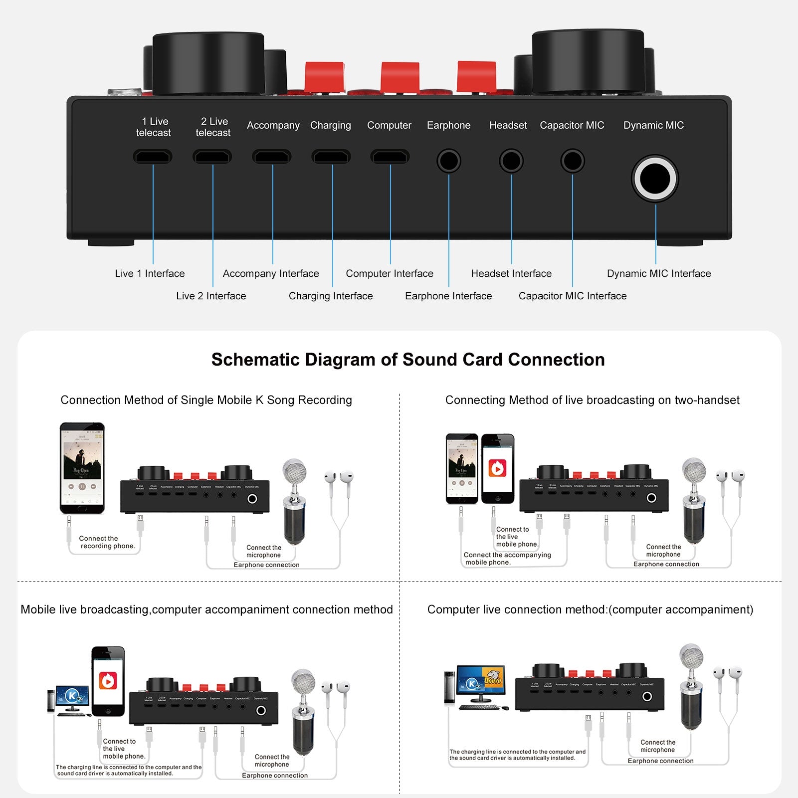 3. Multi-device support: Compatible for one mobile phone K song live, double cell phone live, mobile phone computer synchronous live, one computer live, computer accompaniment cell phone live, instrument input cell phone live.