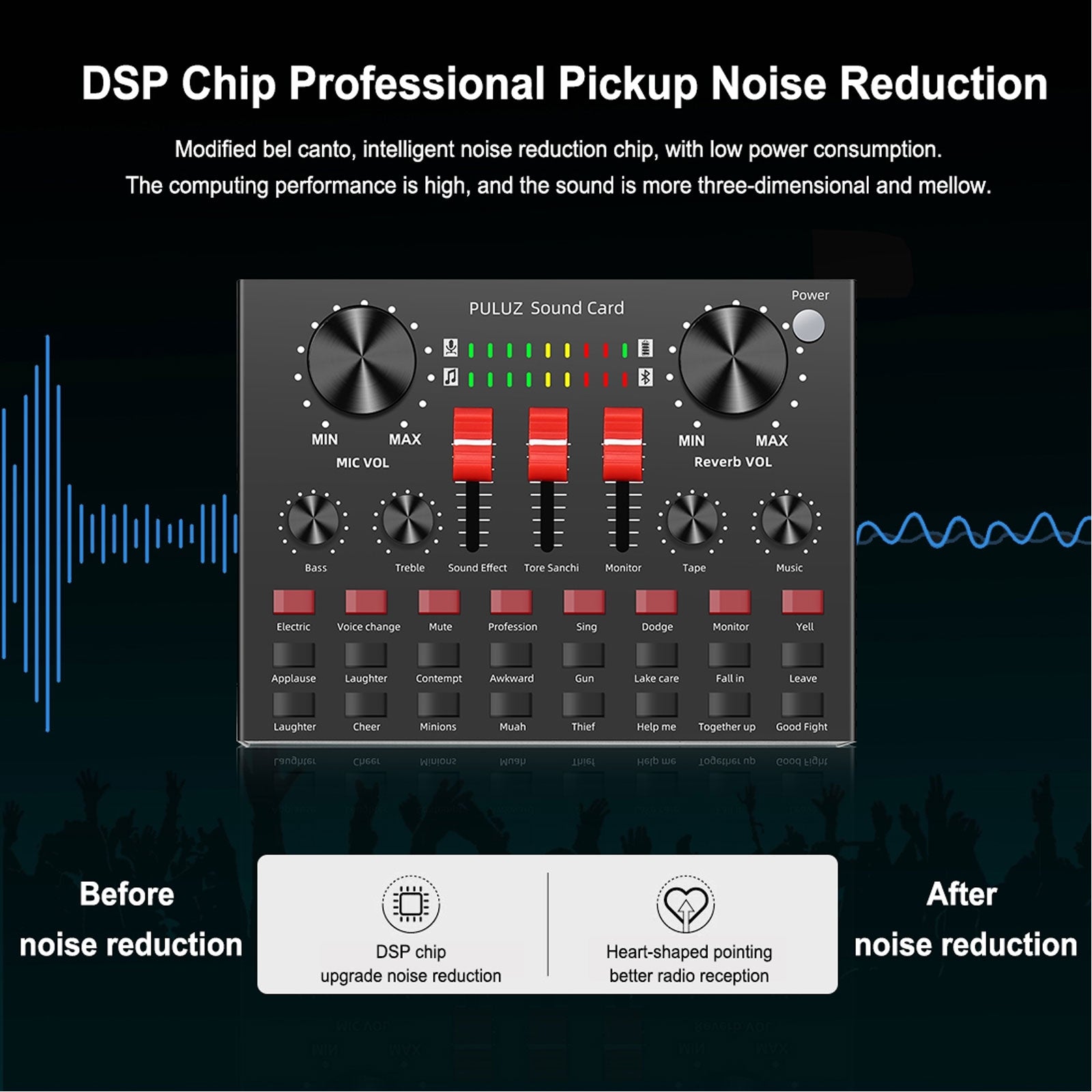 1. Professional noise reduction technology: Built-in dual DSP noise reduction chip and ECHO, there are dual DSP noise reduction chips inside the sound card voice changer to avoid the influence of current noise, ensure high quality sound, and sing beautiful songs, Reverb (ECHO) makes your voice more charming.